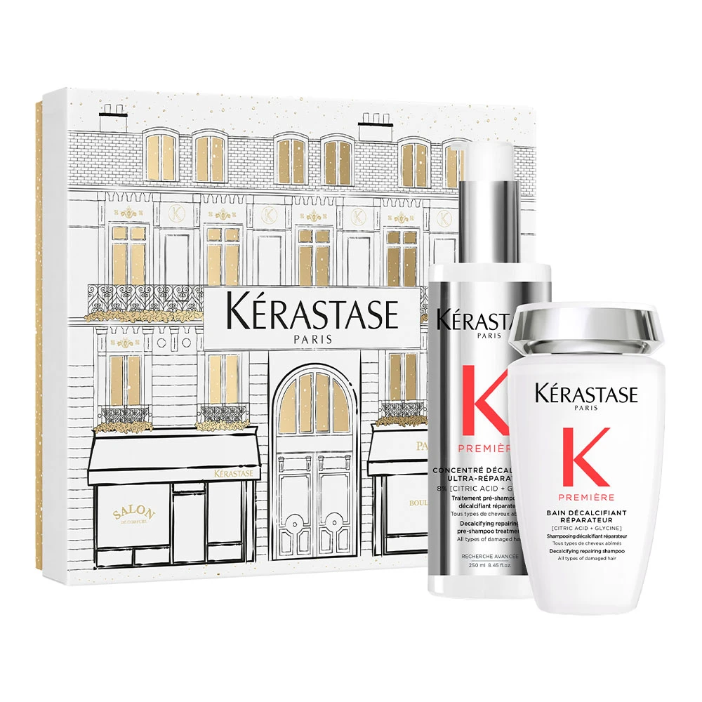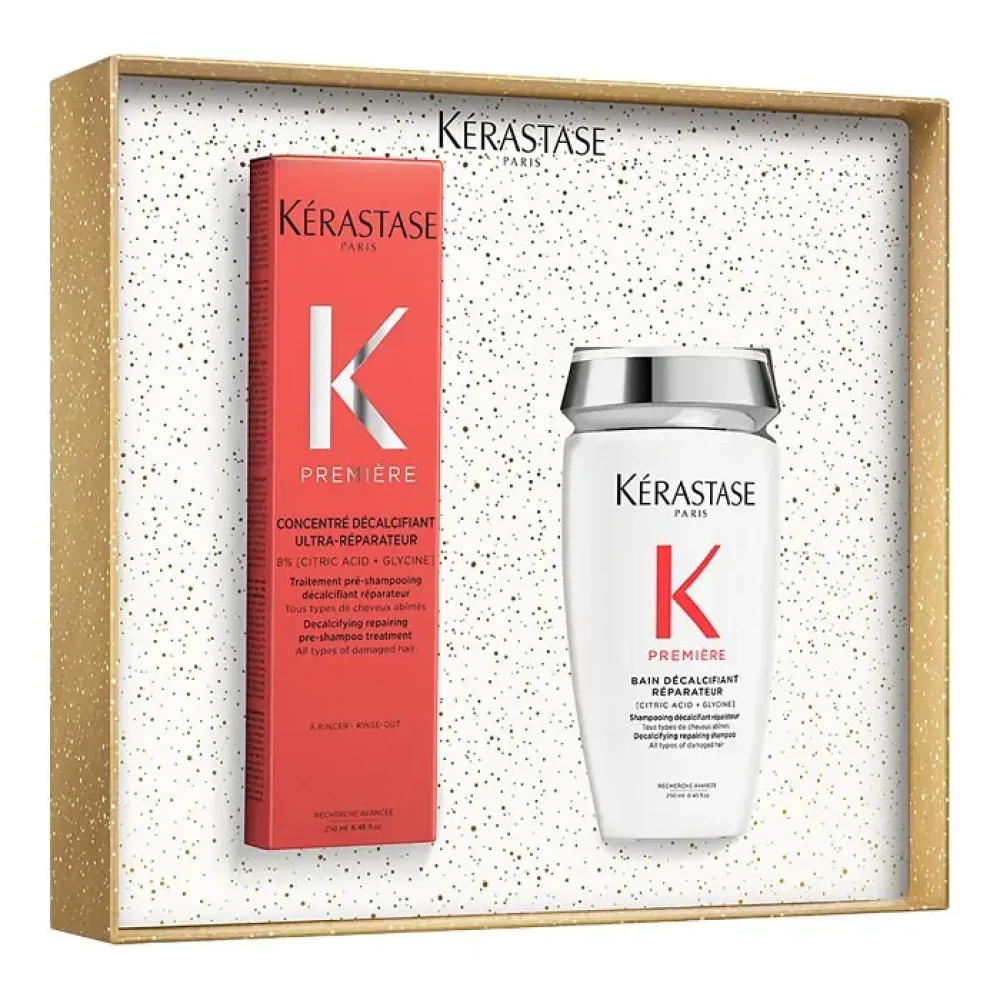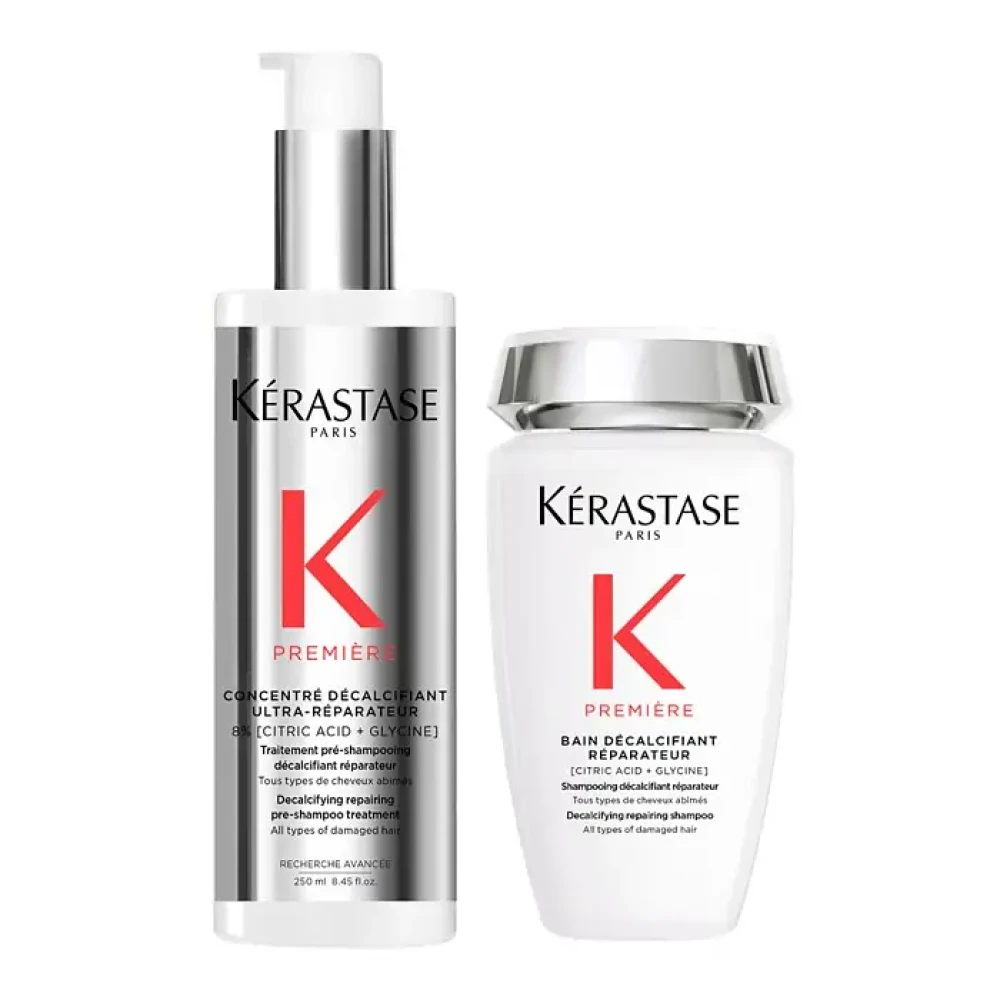 Набір Première — це ритуал відновлення для волосся, яке втратило блиск і еластичність через жорстку воду та пошкодження. Формули з лимонною кислотою та гліцином допомагають усунути накопичений кальцій, відновлюють пошкоджені кератинові зв’язки та повертають волоссю шовковистість уже після перших застосувань. У комплекті — декальцинувальний прешампунь-догляд, що готує волосся до очищення та шампунь-ванна, який делікатно, але ефективно очищує та зменшує ламкість і тьмяність.