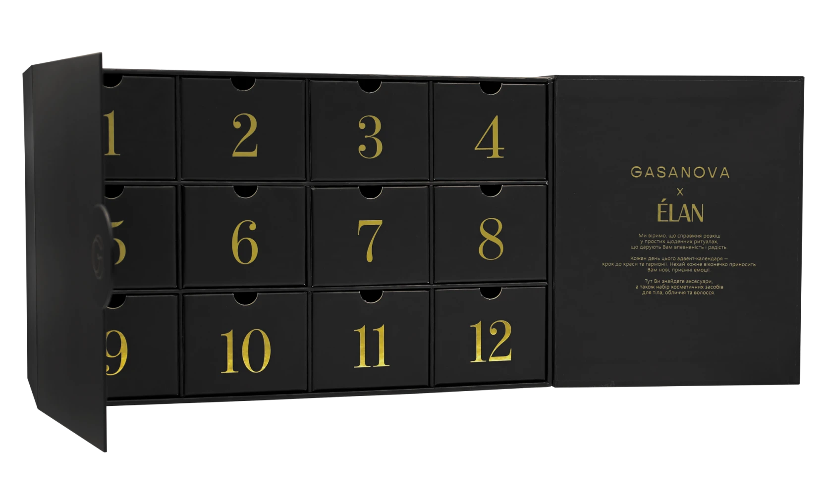 Один з головних українських fashion-брендів GASANOVA об’єднався з брендом професійної косметики ÉLAN і випустив адвент-календар, що поєднує естетику розкоші, вишукані текстури й чуттєві аромати засобів та відчуття свята. У наборі — запашні доглядові засоби для тіла, продукти для макіяжу, ніжні шовкові аксесуари та інші сюрпризи, які щодня покращуватимуть настрій і додаватимуть тепла у зимові дні.