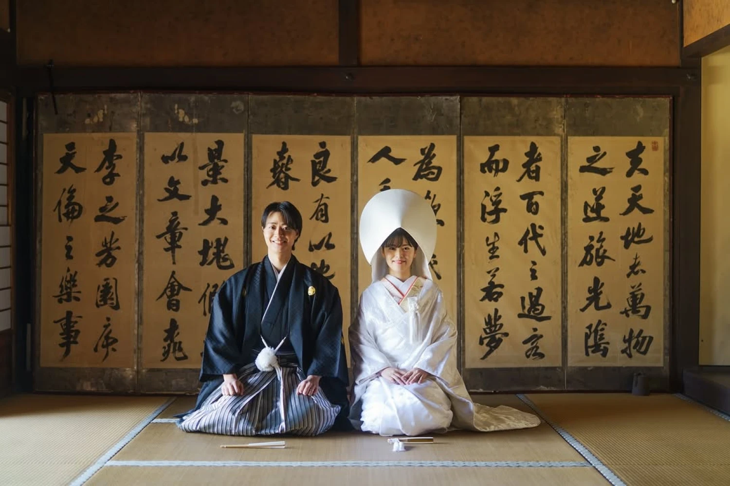 Японські весілля поєднують давні синтоїстські обряди й сучасні західні формати. Традиційна церемонія відбувається в синто-храмі у тісному родинному колі. Священник очищує простір, читає молитви богам-камі, молодята приносять дари, а кульмінацією стає церемонія сан-сан-кудо — по три ковтки саке з трьох чаш. Дев’ять ковтків символізують союз двох родин і гармонію небес, землі та людей; малі, середні й великі чаші — минуле, теперішнє й майбутнє.