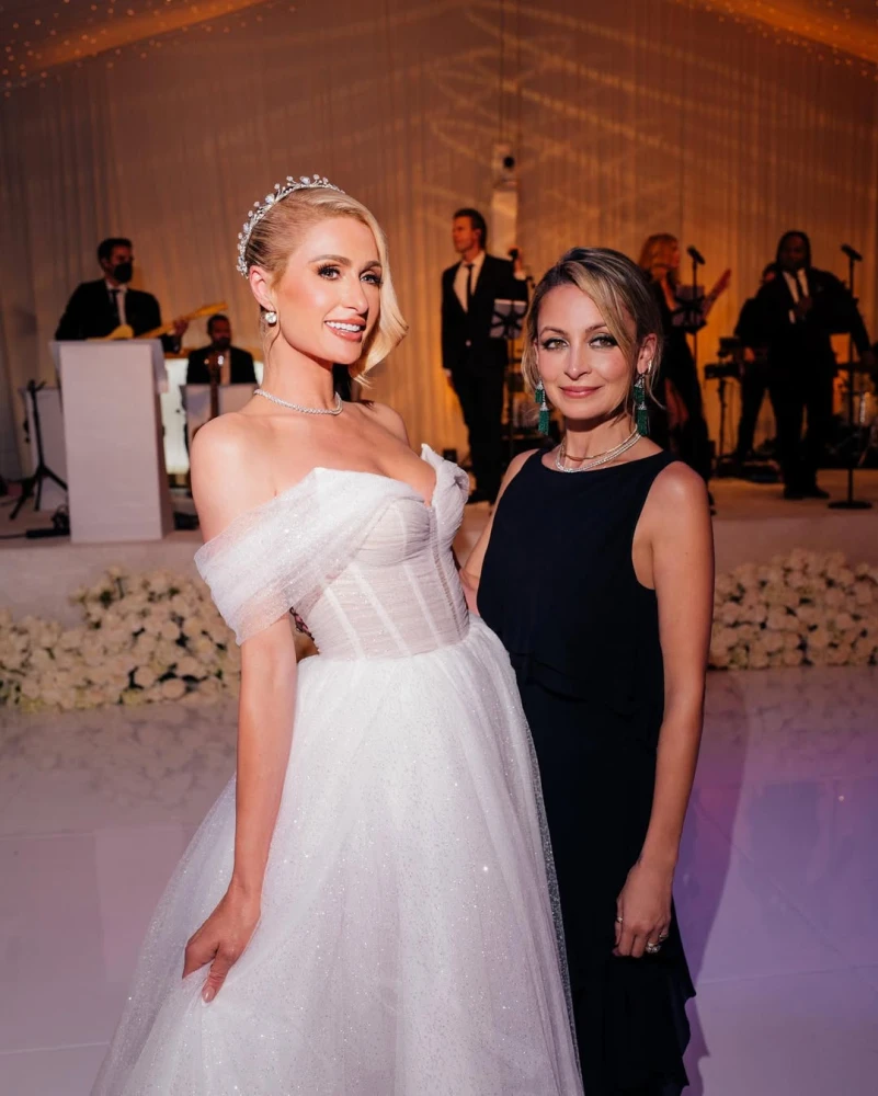 Весільний образ світської левиці втілює її впізнаваний стиль: активний мейк очей з ефектними накладними віями та золотистим сяйвом, і зачіска з високим пучком, бічним проділом та випущеним пасмом, укладеним як «голлівудська хвиля».
