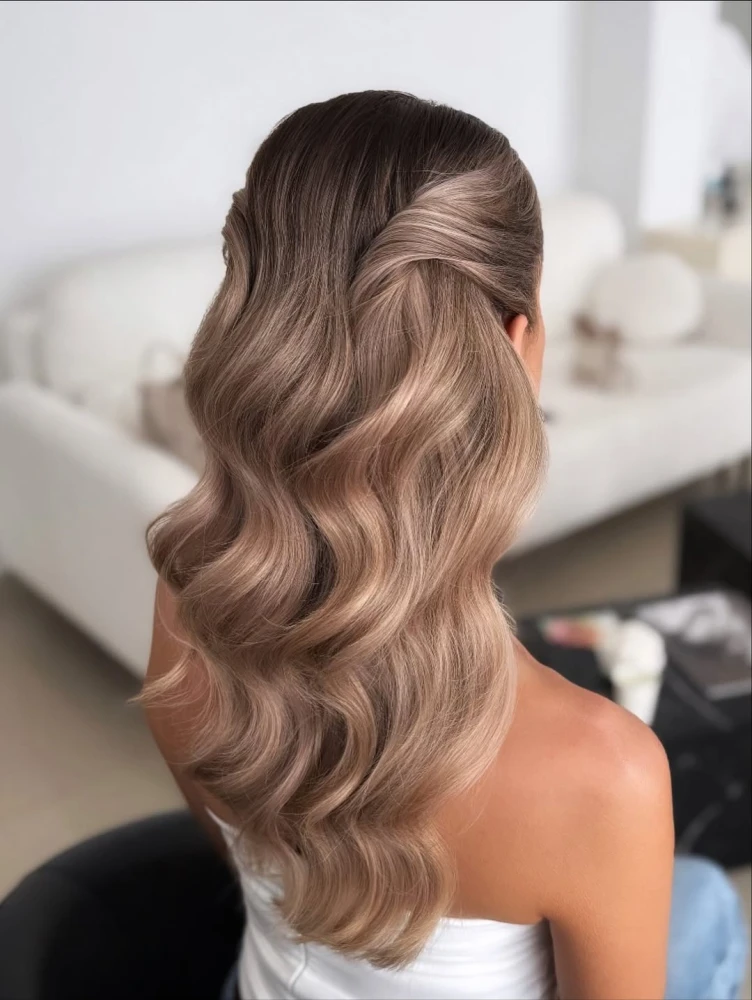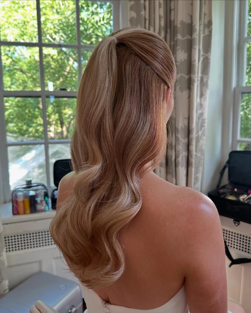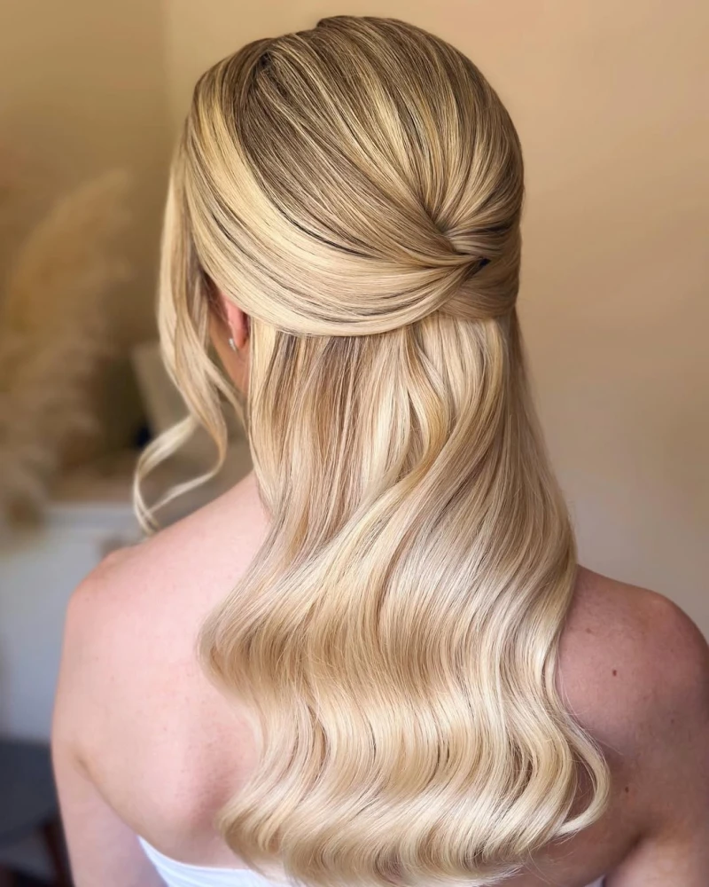 Така зачіска матиме гармонійний вигляд у поєднанні й з обʼємною сукнею зі шлейфом, і з мінімалістичним образом у легкій струмливій сукні, адже half up half down не перетягує увагу на себе складними лініями. Це укладання передбачає зібраний на потилиці верхній шар волосся і має різні варіації — це може бути акуратний хвіст, два заведених назад пасма коло обличчя, які мʼяко переходять у решту довжини, чи пасма, що перетинаються ззаду хрест-навхрест. Half up half down чудово виглядає і з гладеньким волоссям, і з мʼякими хвилями — по всій довжині або ближче до кінчиків.