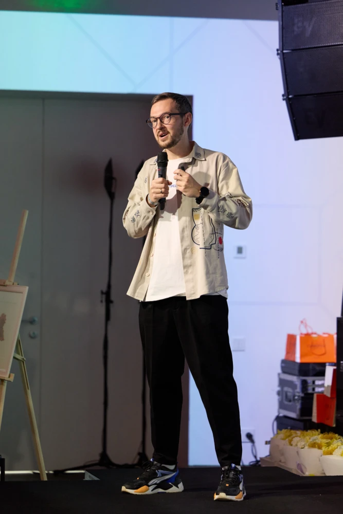 Відкрив подію своєю презентацією на тему «ШІ в житті та кар’єрі» Дмитро Красовський — AI Integration Lead у маркетинговому агентстві Netpeak.