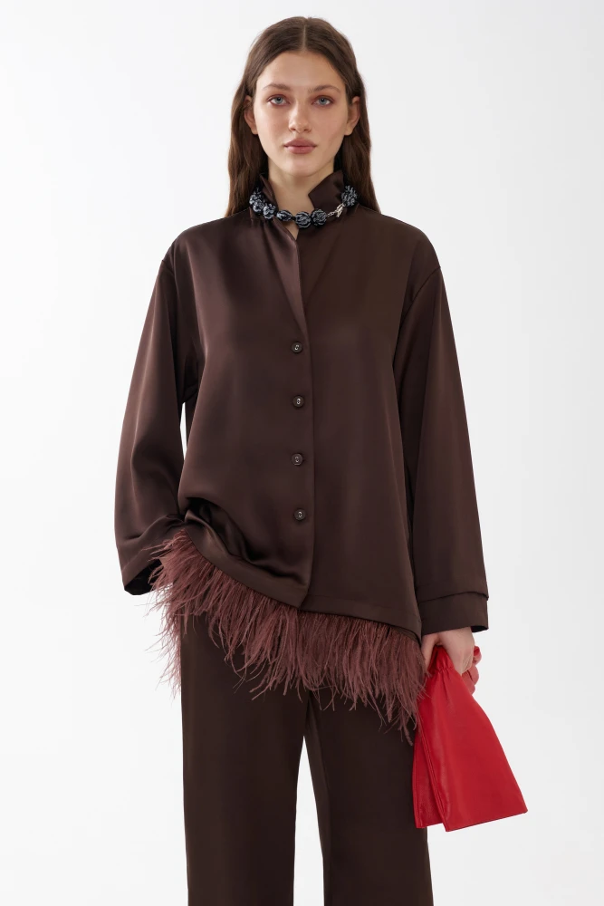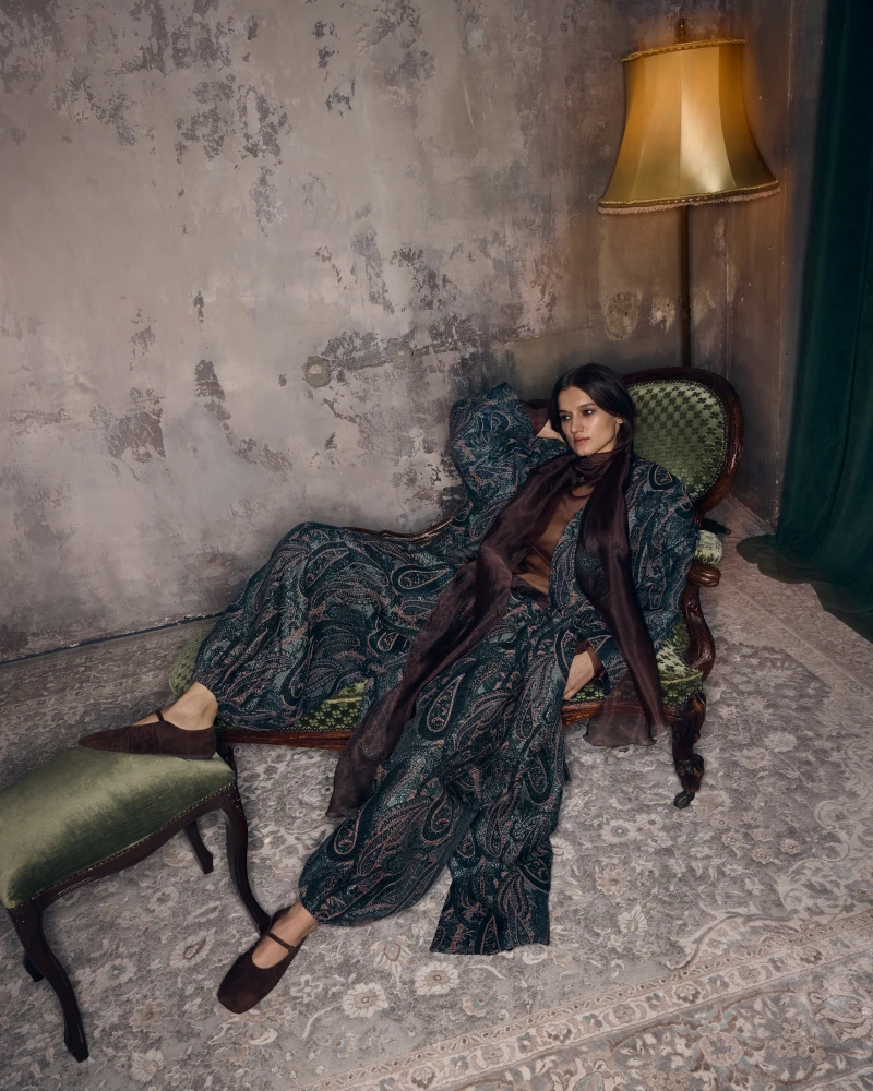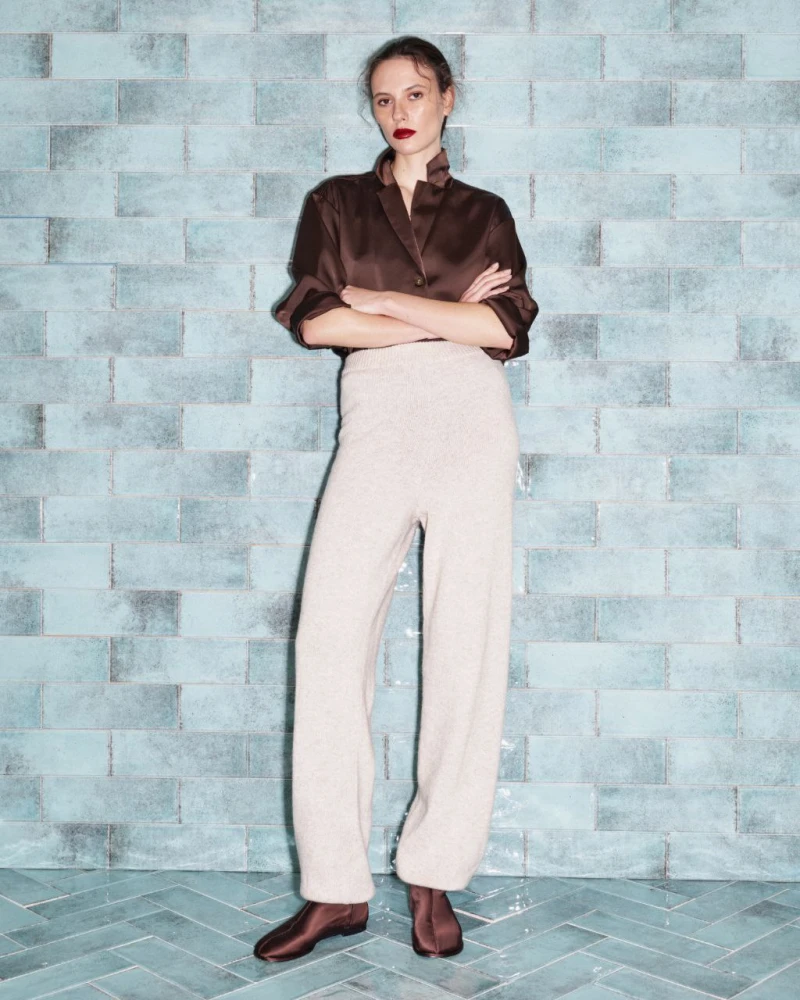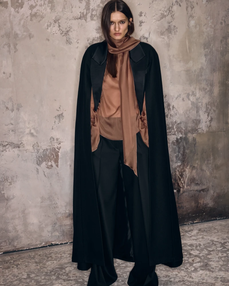 До нового дропу увійшли оксамитові піжамні сети в естетиці будуар, костюм з оверсайз-фраком та брюками з лампасами, що створюють сучасну класику, блузи із шовку та органзи, кейпи із сатиновими лацканами, жакардові костюми з кімоно та брюки-аладини з виразною текстурою.