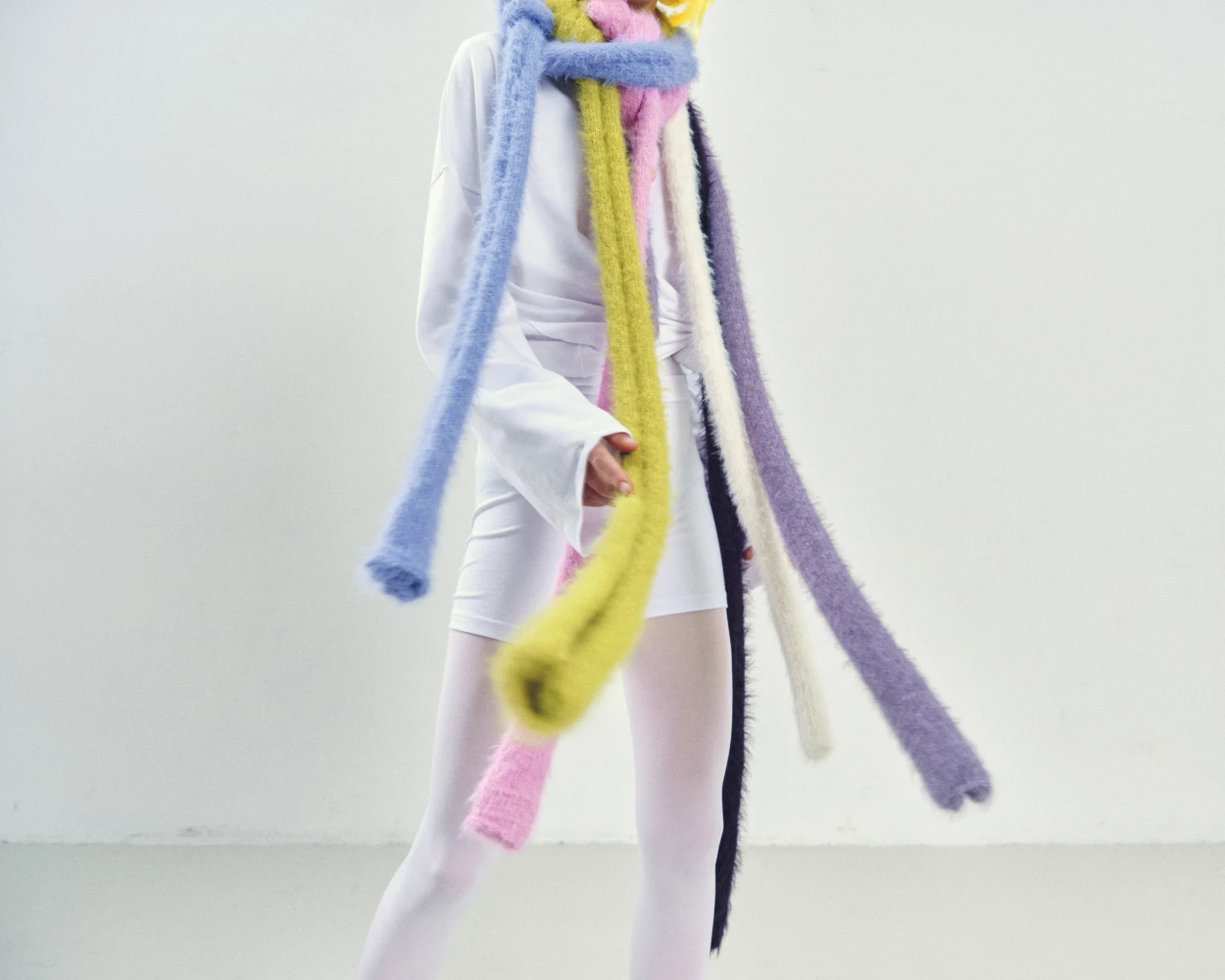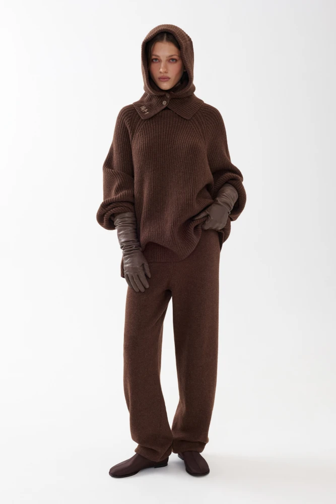 Центральними елементами DOTYK стали вироби, що втілюють ідею дослідження дотику. М’яка вовна та делікатний кашемір поєднуються у силуетах, що зігрівають і рухаються разом з тобою. Трикотаж м’яко підлаштовується під рух і стає другою шкірою, зберігаючи тепло. Шапки, шарфи, светри й теплі штани — кожен елемент має власний дотик: м’який, щільний і такий, що огортає з перших секунд.