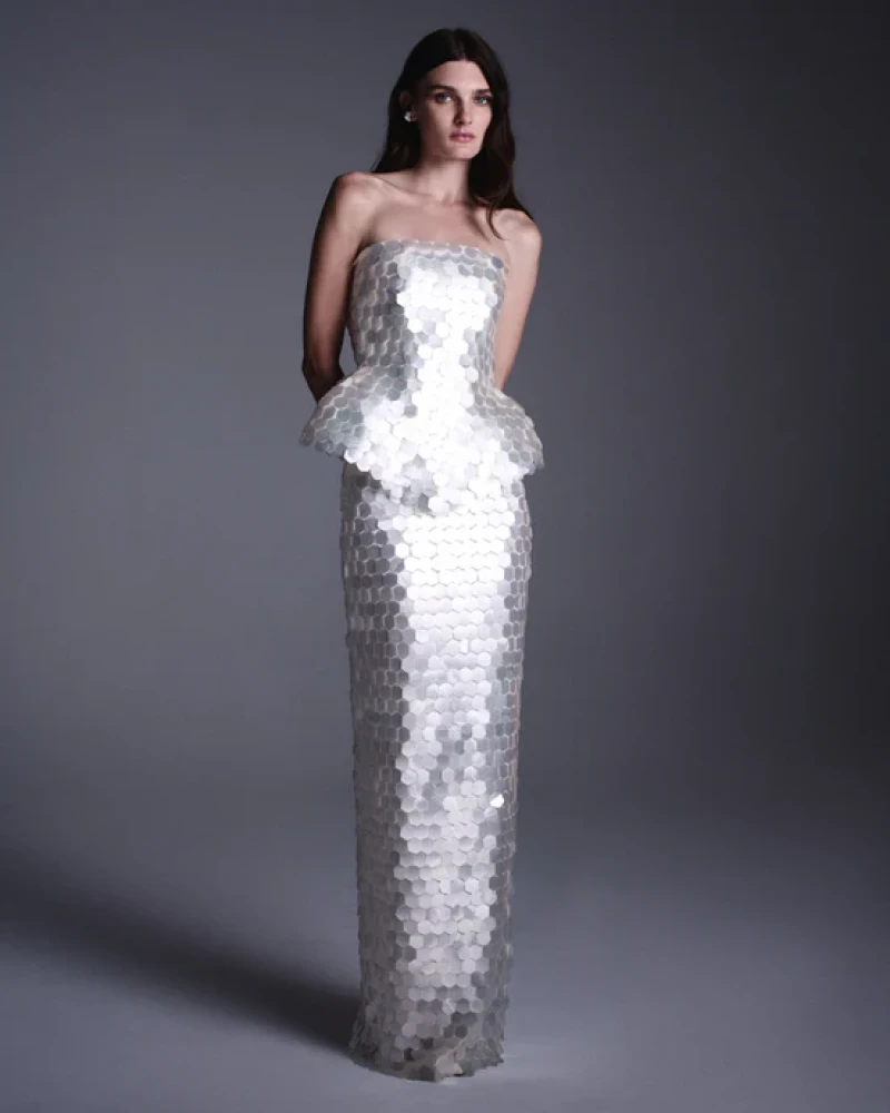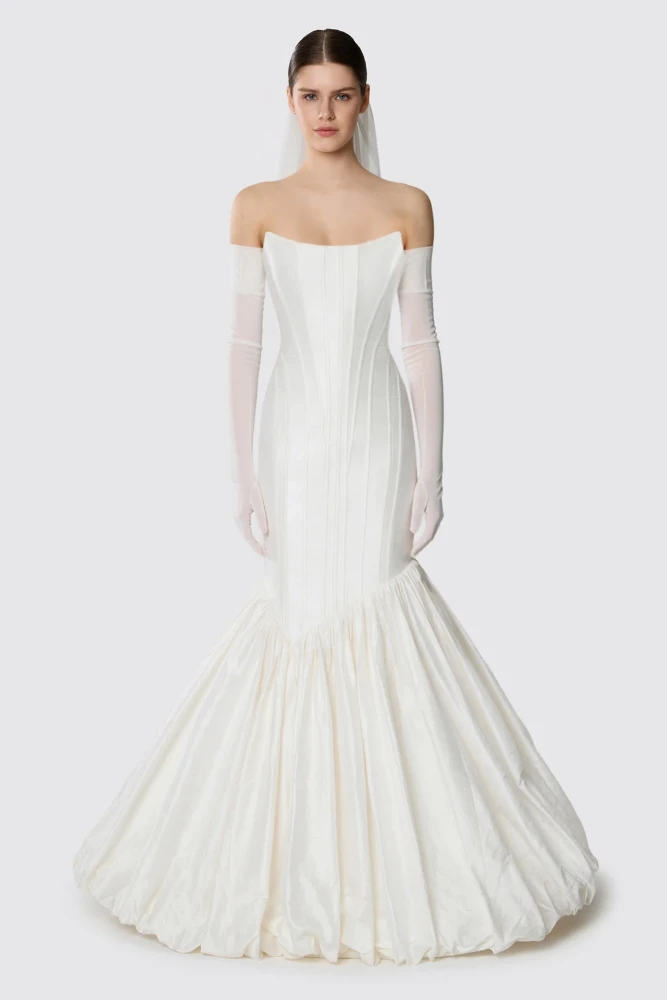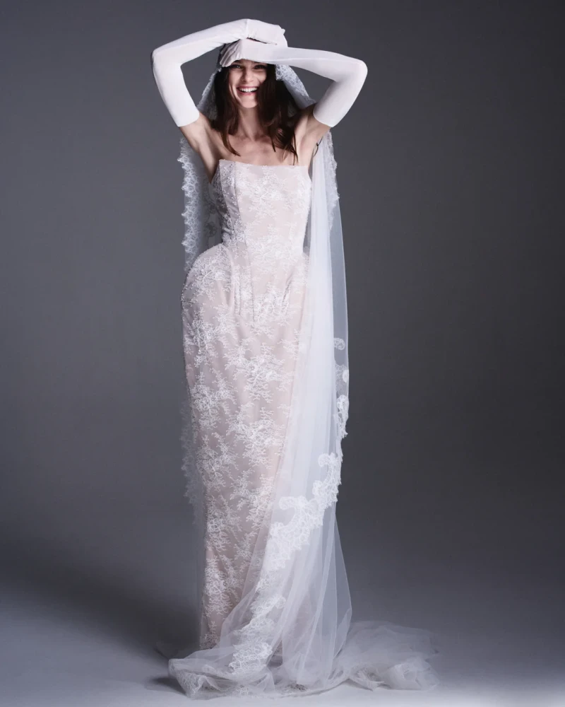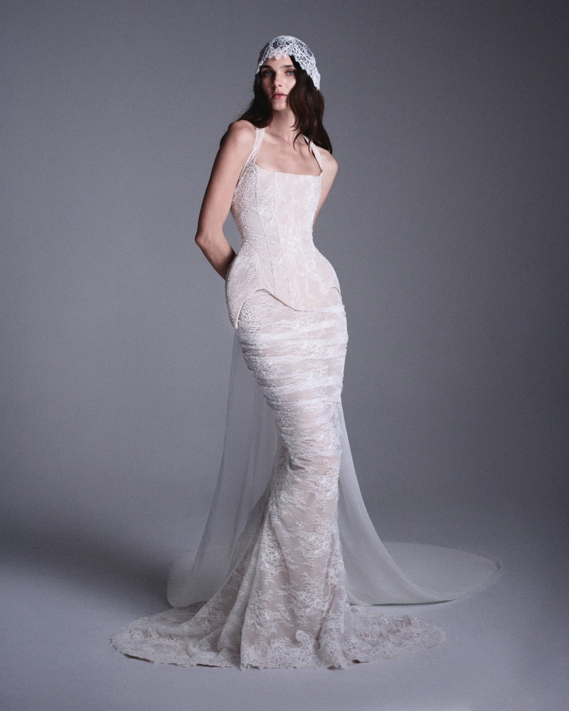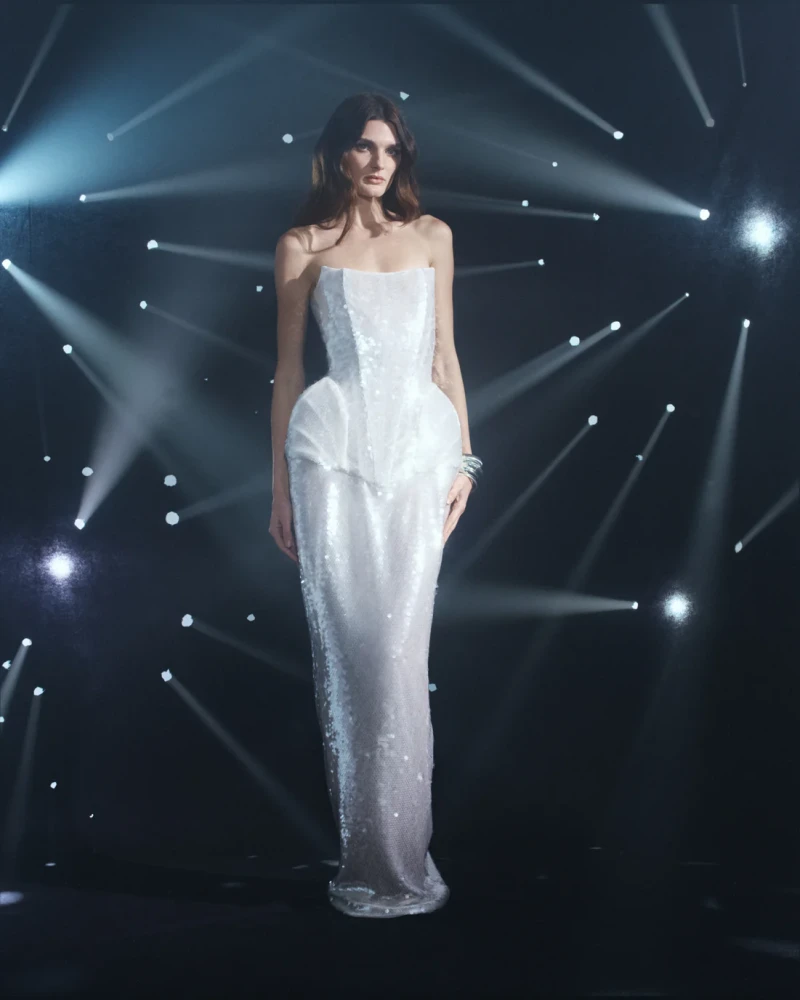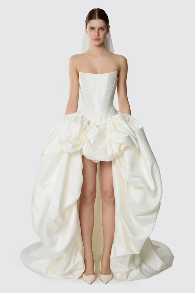 У центрі колекції — сучасна наречена, яка природно опиняється в центрі уваги. До неї увійшли мінімалістичні сукні-бюстьє, корсети, міні зі шлейфами, трансформери та оновлені знакові моделі бренду, що дозволяють змінювати образ протягом святкування.