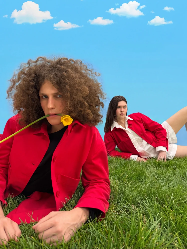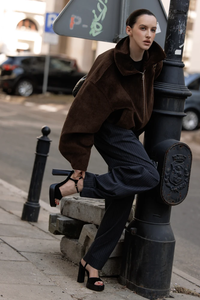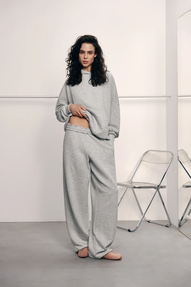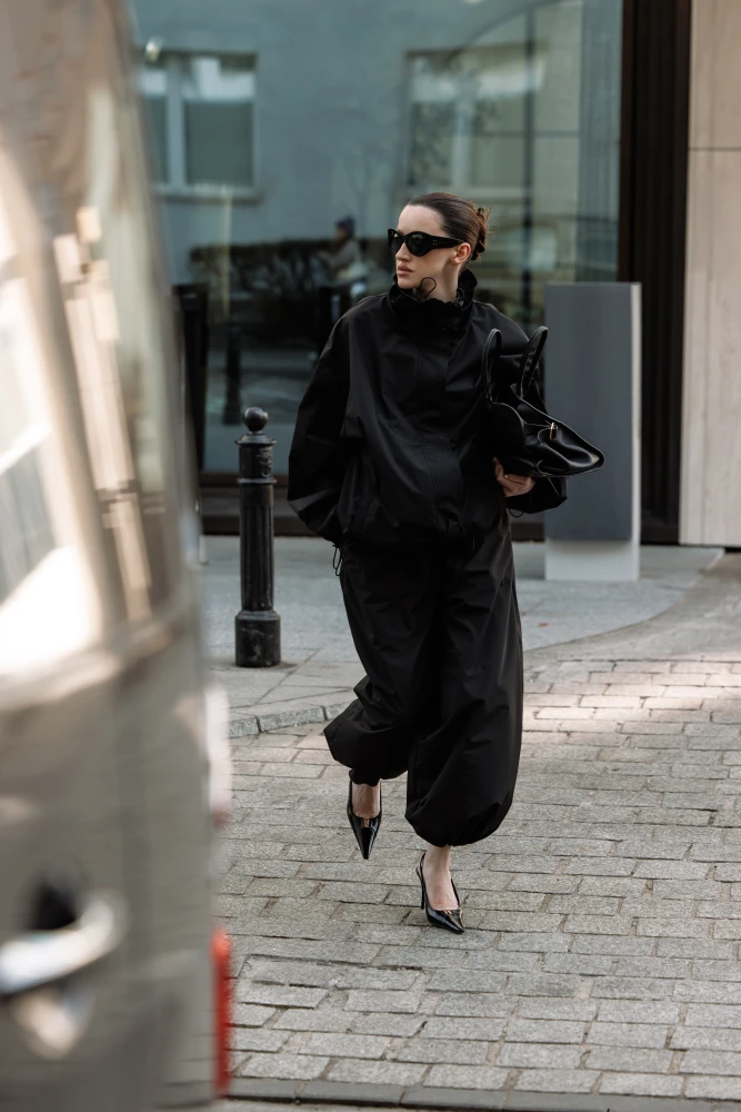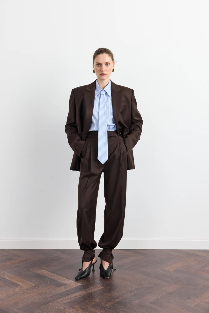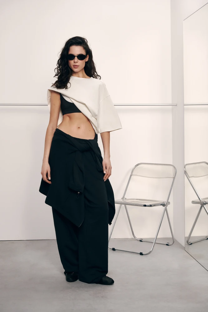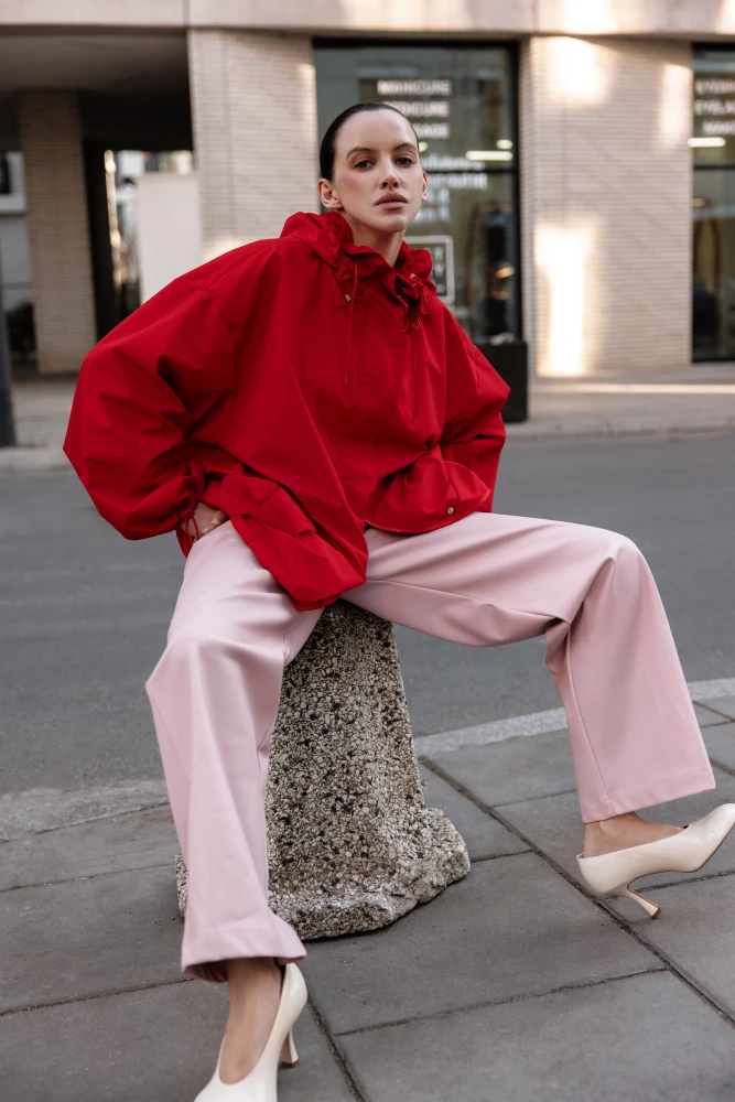 Відкривають колекцію спортивні костюми WIND: об’ємні куртки-вітрівки та штани з матової плащової тканини в акцентному червоному та чорному кольорах. Серію доповнюють легкі WIND shorts, розраховані на багатошарові поєднання. Жакетна лінія включає чотири моделі з різним характером: оверсайз KAIA з акцентними плечима у темно-сірій смужці, подовжений жакет-пальто mocko у теплому відтінку моко, укорочений жакет прямого крою зі структурної тканини та вельветовий бомбер MARGOT укороченої довжини з об’ємним силуетом. Усі моделі побудовані на чіткій лінії плеча як ключовому конструктивному елементі бренду. А брюки MIRA з екошкіри — одна із центральних позицій колекції. Вільний прямий крій та середня посадка формують витриманий силует без зайвих деталей.