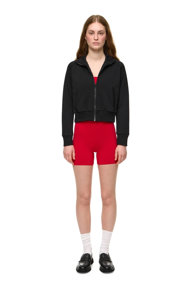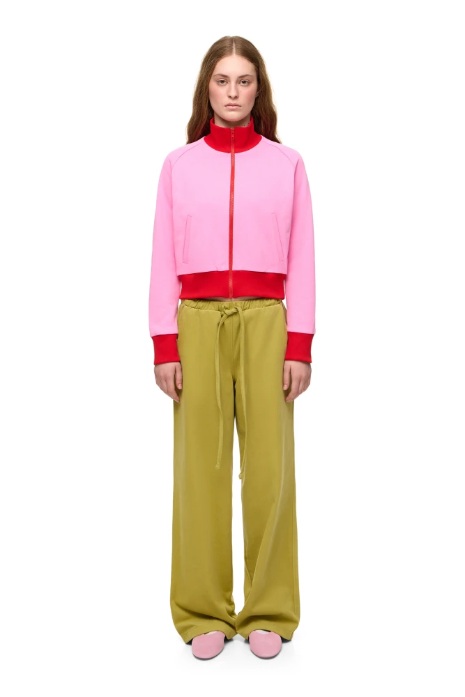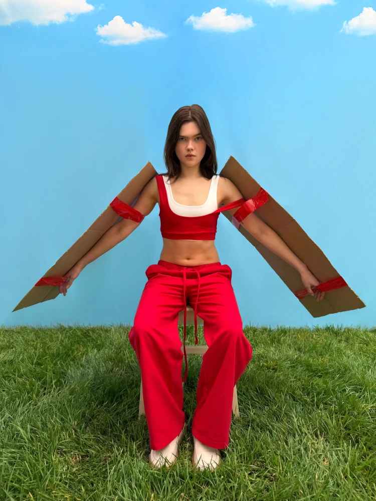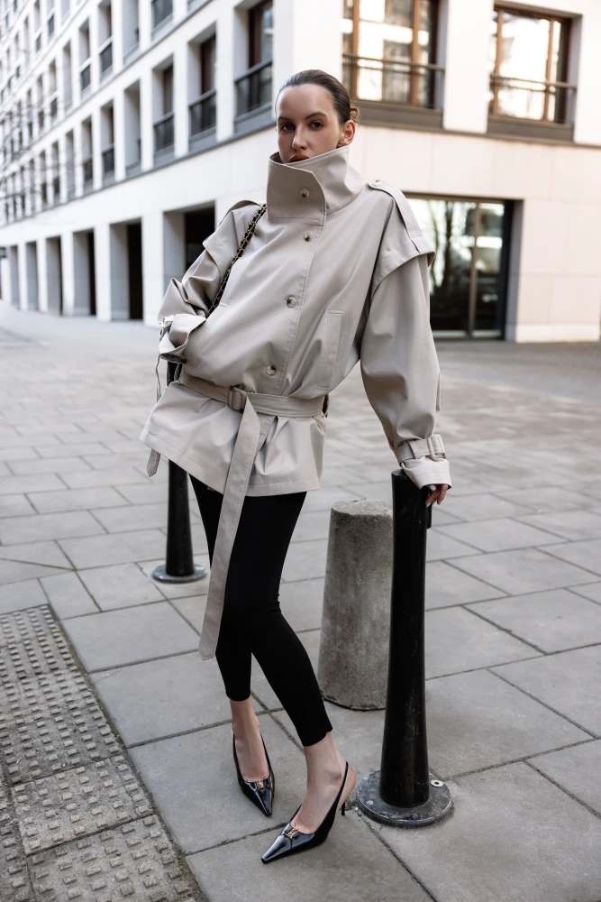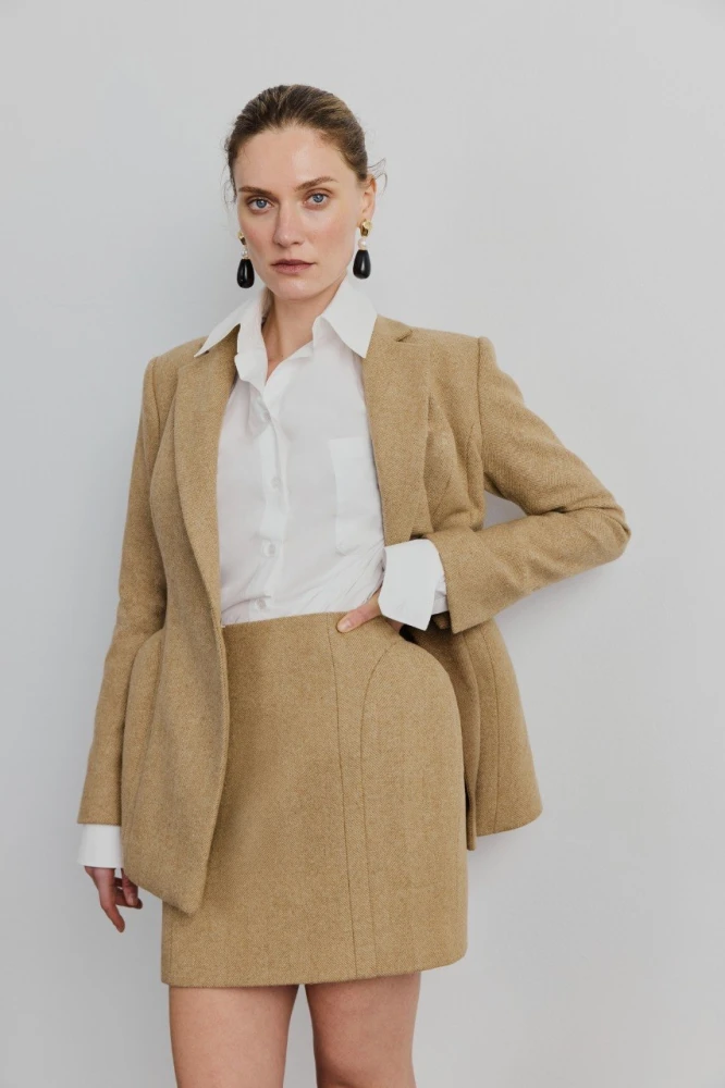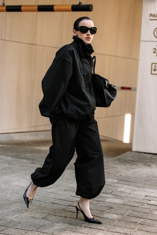 Відкривають колекцію спортивні костюми WIND: об’ємні куртки-вітрівки та штани з матової плащової тканини в акцентному червоному та чорному кольорах. Серію доповнюють легкі WIND shorts, розраховані на багатошарові поєднання. Жакетна лінія включає чотири моделі з різним характером: оверсайз KAIA з акцентними плечима у темно-сірій смужці, подовжений жакет-пальто mocko у теплому відтінку моко, укорочений жакет прямого крою зі структурної тканини та вельветовий бомбер MARGOT укороченої довжини з об’ємним силуетом. Усі моделі побудовані на чіткій лінії плеча як ключовому конструктивному елементі бренду. А брюки MIRA з екошкіри — одна із центральних позицій колекції. Вільний прямий крій та середня посадка формують витриманий силует без зайвих деталей.
