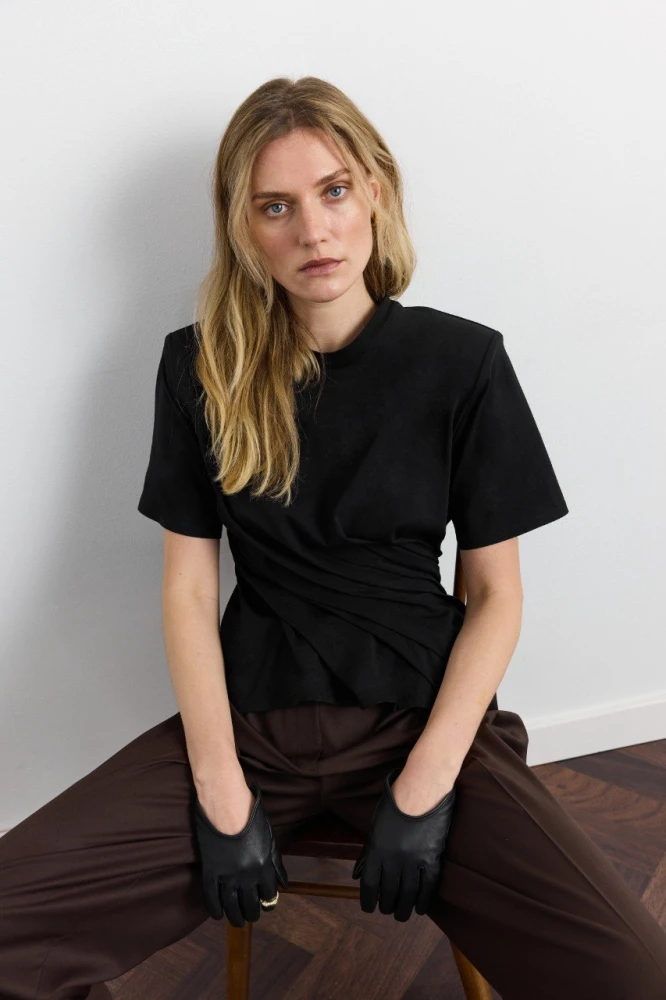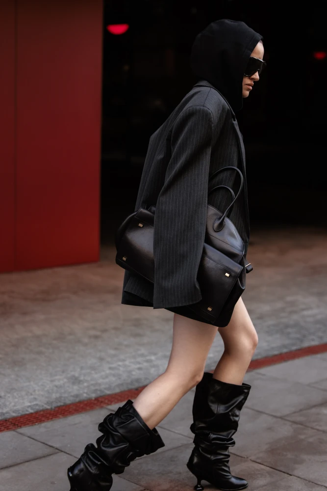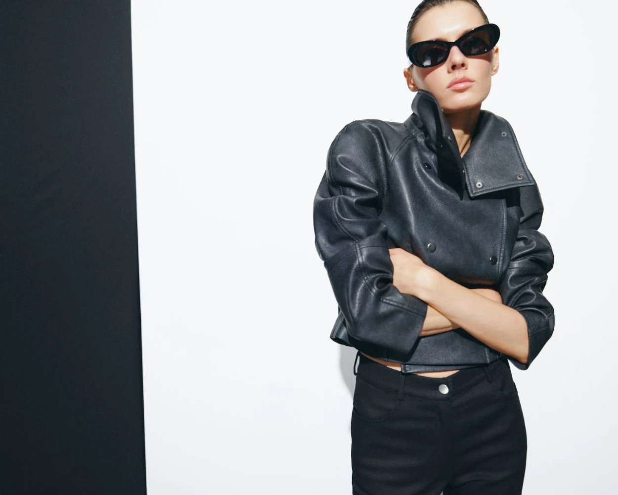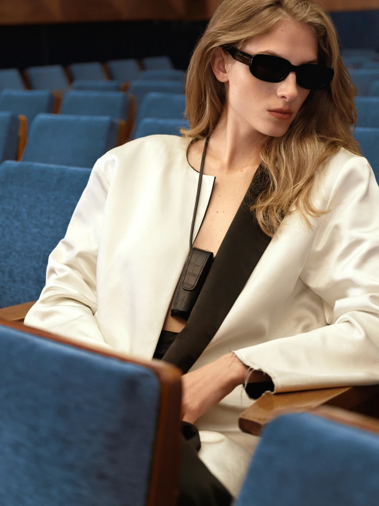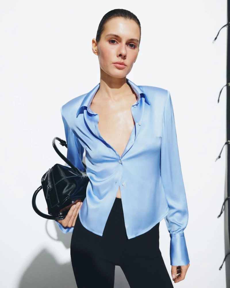 Серед ключових айтемів колекції — котонова куртка у глибокому синьому відтінку та шкіряна куртка з правильно вибудуваними гіпертрофованими плечима, які підсилюють графічність силуету та додають образам упевненого характеру.