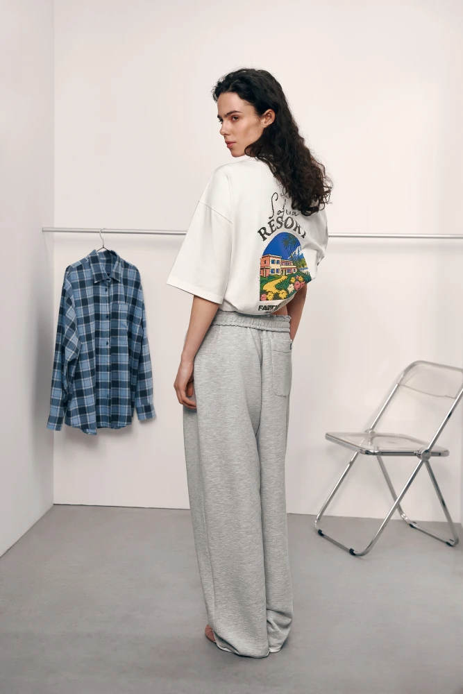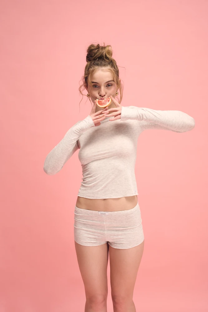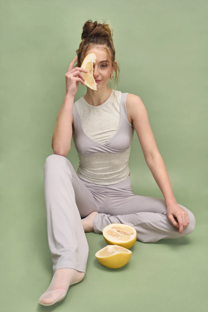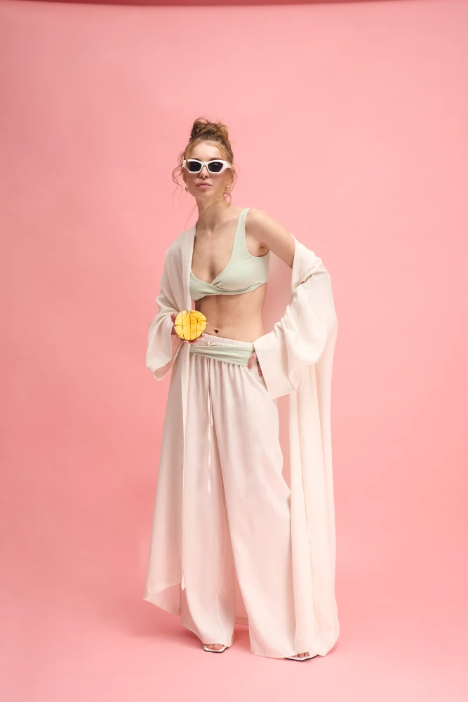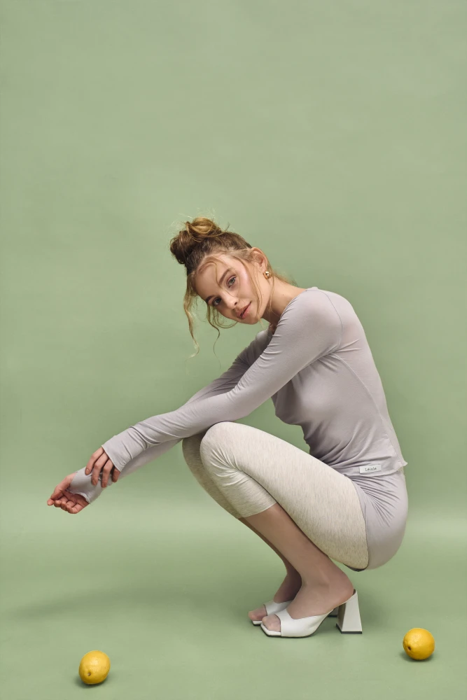 У центрі колекції — одяг, що делікатно повторює лінії тіла та створює відчуття абсолютного комфорту. Лаконічні топи та туніки, м’які комплекти, футболки та легінси виконані з інноваційної тканини тенсел — екологічного матеріалу нового покоління, створеного з деревної целюлози евкаліпта. Його шовковиста текстура дозволяє шкірі дихати та дарує відчуття природної легкості. Візуальна мова колекції побудована на образах свіжості та чистоти: пастельні відтінки, м’яке світло, соковиті цитруси та грайливі деталі створюють атмосферу безтурботного літа і нагадують про прості радощі життя.