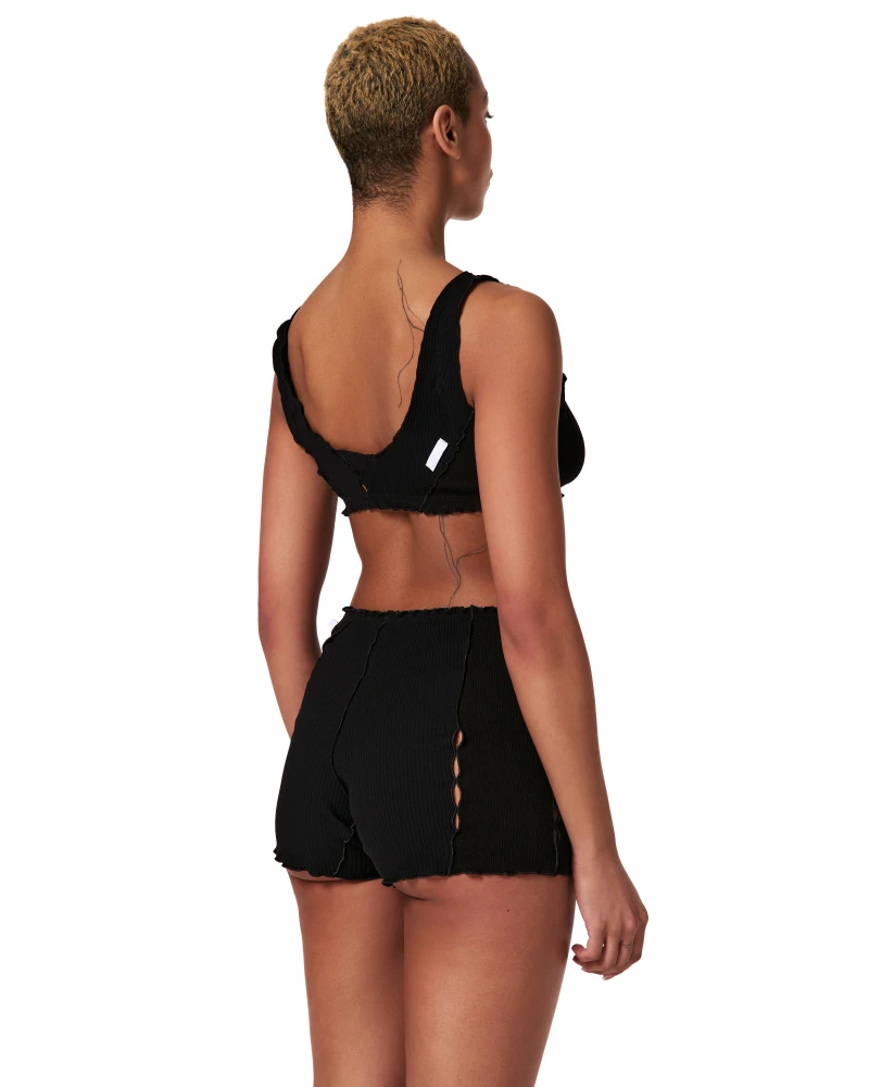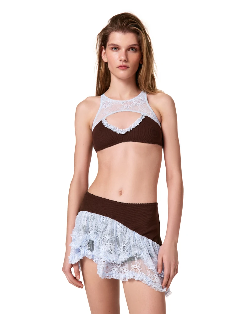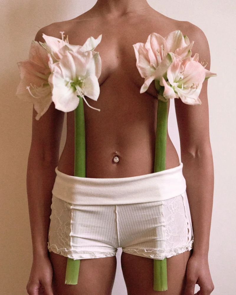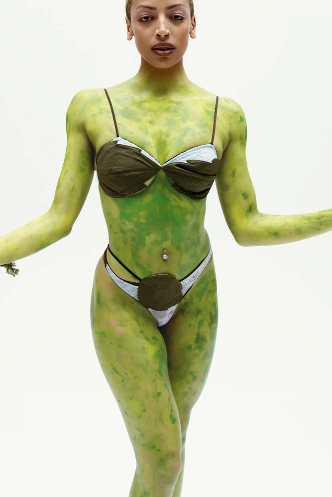Естетика розквіту проявляється у делікатних текстурах та силуетах, натхнених самою природою. Мереживо стає витонченим переосмисленням домашнього одягу: від майок і худі до знакових комплектів з подвійним топом та трусиками танга. Артистизм бренду розкривається у скульптурній базі — футболках з імітацією ліфа чи фігурним вирізом та авангардному комбінезоні з об’ємним верхом. Для повного занурення у ботанічну естетику ліф і танга з листям стають прямим містком між шкірою та рослинною формою. Завершують колекцію універсальні базові моделі — шорти з поясом та спідниця-шорти у двох варіаціях.