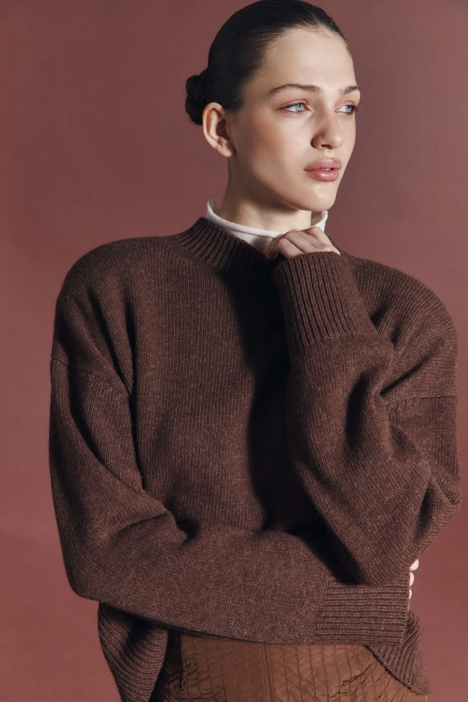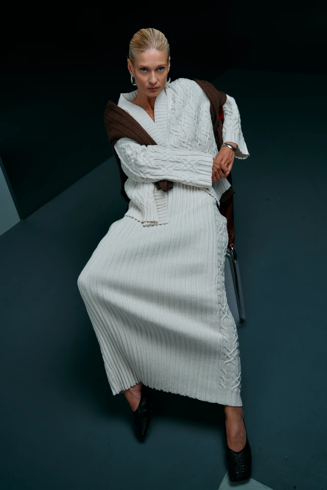 Вовна, шовк, кашемір — теплі й фактурні матеріали, що переважають у цьому дропі. Натуральна овеча шкіра та ефектна екозамша надають силуетам упевненості та стрижня. Затишний вовняний светр у смужку поєднує зелені, рожеві та бордові відтінки, даруючи відчуття тепла кольорового жовтня. Червона мініспідниця з екошкіри та вишневе пальто максі стають акцентами, які переписують правила осіннього гардероба.
