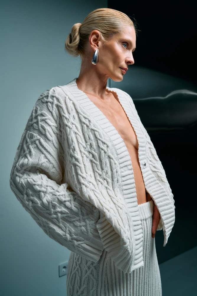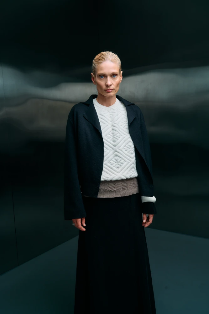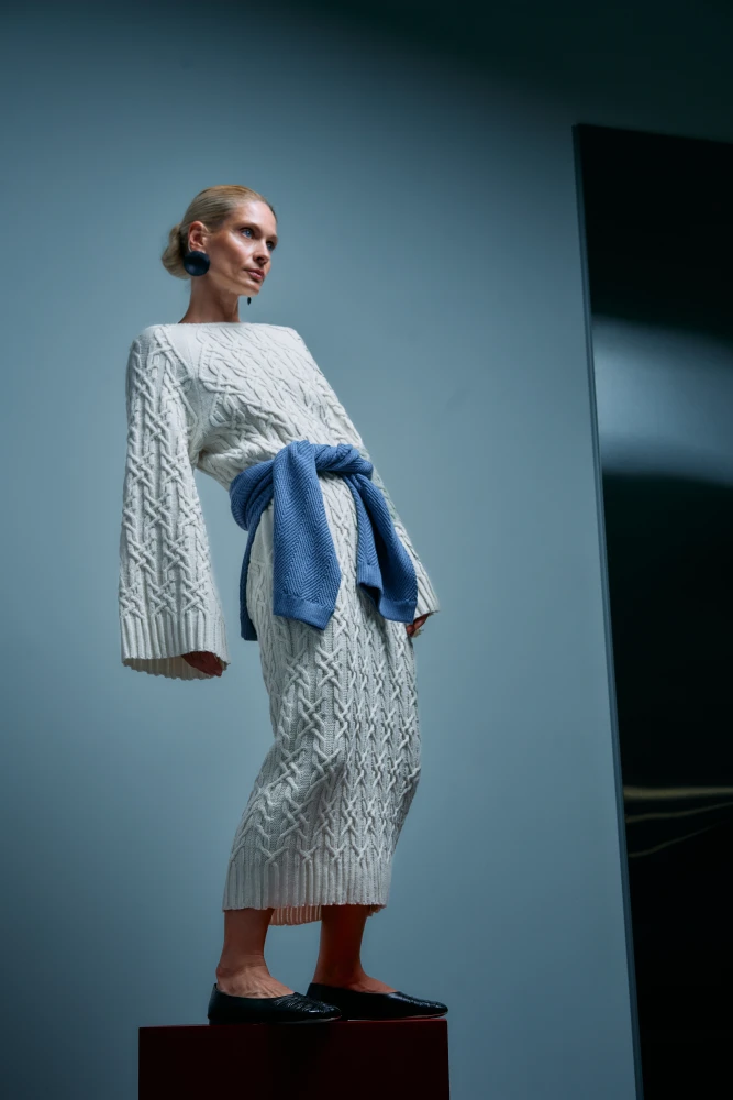 Кожна річ створена з особливою увагою до фактури — складне ручне та машинне переплетіння ниток утворює об’ємні структури, рельєфні візерунки та м’яку архітектоніку трикотажу. Особливість колекції — арани, традиційні для скандинавського в’язання мотиви, які в цій інтерпретації набувають символічного звучання: вони нагадують вузли пам’яті, що з’єднують різні культури.