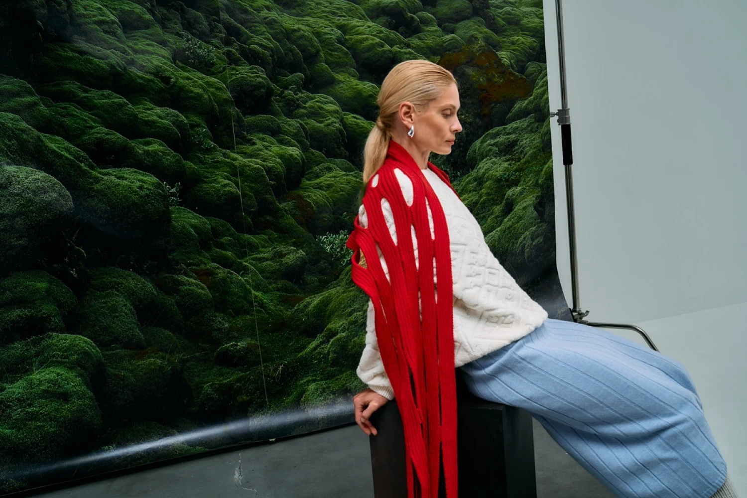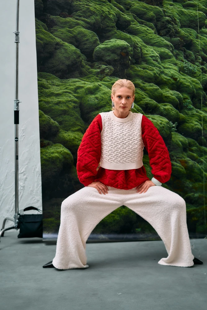У процесі роботи використовувалися комбіновані техніки трикотажу, серед яких — складні багатошарові плетіння, інверсні рельєфи та зміна натягу нитки, що дозволяють створювати гру світла й тіні на поверхні виробу. Однією із центральних новинок колекції стало пальто-кардиган з вовни ягняти — річ прямого вільного силуету, із заниженою лінією плечей та англійським коміром. У ньому використано переплетіння «плюш», що поєднує гладкі та об’ємні ділянки, відтворюючи складний однотонний орнаментальний малюнок, запозичений з гобелена з Оверхогдаля.