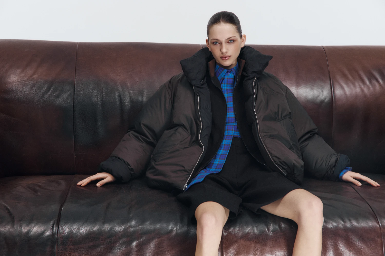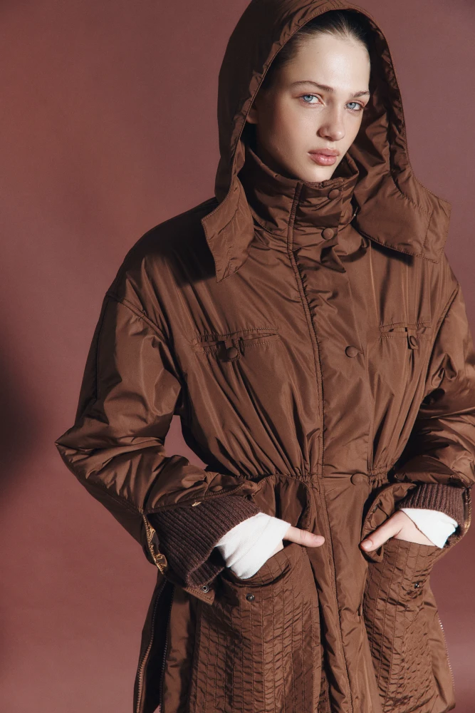 У центрі дропу — базові силуети: двосторонні пуховики з принтами, пальта, костюми та сорочки у відтінках шоколадного, темно-синього та глибокого чорного.