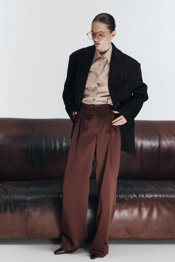 Основу колекції складають оверсайз-піджак, прямі штани, сорочка, базовий лонгслів та краватка. Водночас бренд оновлює лінійку своїх бестселерів: додає нові кольори оверсайз і невагомих лонгслівів, а також повертає велюрові штани та матові легінси, які раніше вже отримали прихильність аудиторії. Це дозволяє створювати цілісний total look від Cuprum Depot, поєднуючи костюмну класику з базою.