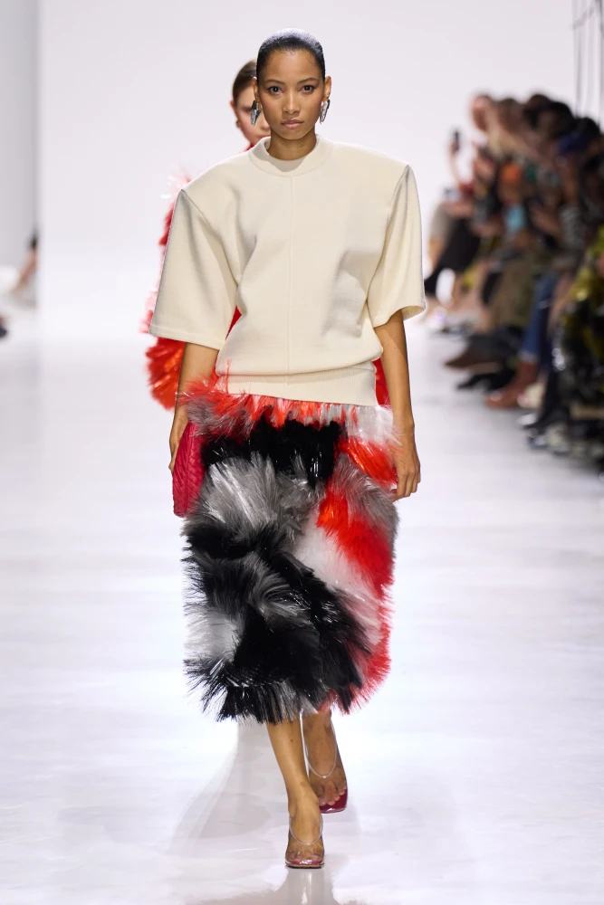 Цікаво, що дизайнери вирішили залишити головною родзинкою саме ці пишні спідниці, тому верх в образах з ними переважно простий і навіть буденний — сорочки, футболки, жакети. Тож якщо для майбутніх особливих подій ти шукатимеш цікавий елемент аутфіту, радимо обрати саме спідницю з об’ємною бахромою, яку легко стилізувати зі своїм улюбленим топом чи блузою, доповнивши образ однією з актуальних пар туфель.