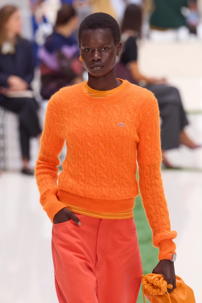 У контексті подіумного яскраво-помаранчевого найчастіше згадують епатажний комбінезон від Jean Paul Gaultier. Саме це виразне обтисле вбрання закріпило тренд на барвистий одяг у 2026 році. Окрім нього, речі у такому насиченому кольорі додали до колекцій Ferragamo, Alaїa, Valentino, Loewe та багато інших брендів.