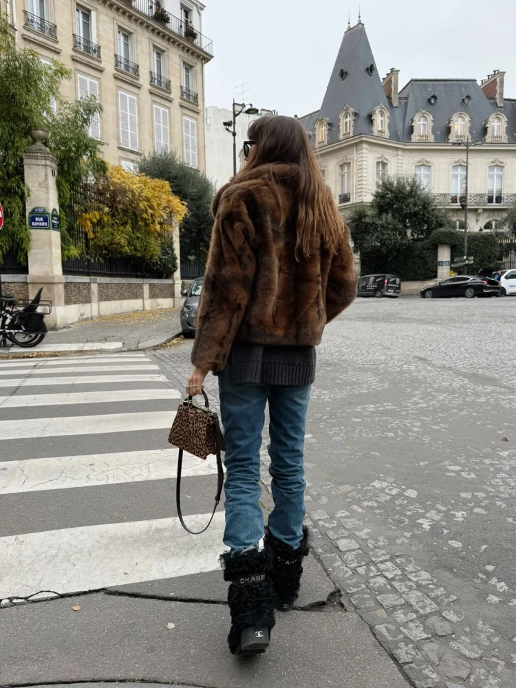 Йдеться про шуби з еко-хутра, які вже стали основою зимових луків стильних француженок. Цього сезону інфлюенсерки масово ігнорують чорний, обираючи глибокі відтінки коричневого: від гіркого шоколаду до кавових зерен. Ця палітра додає образу м’якості, але зберігає необхідну для базового гардероба універсальність.