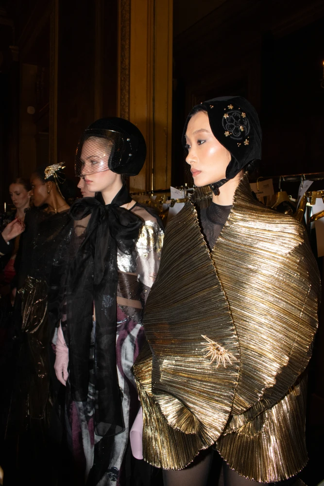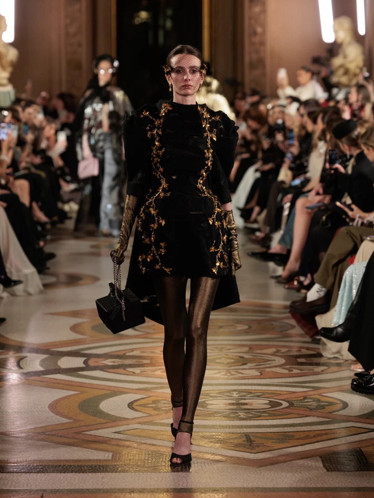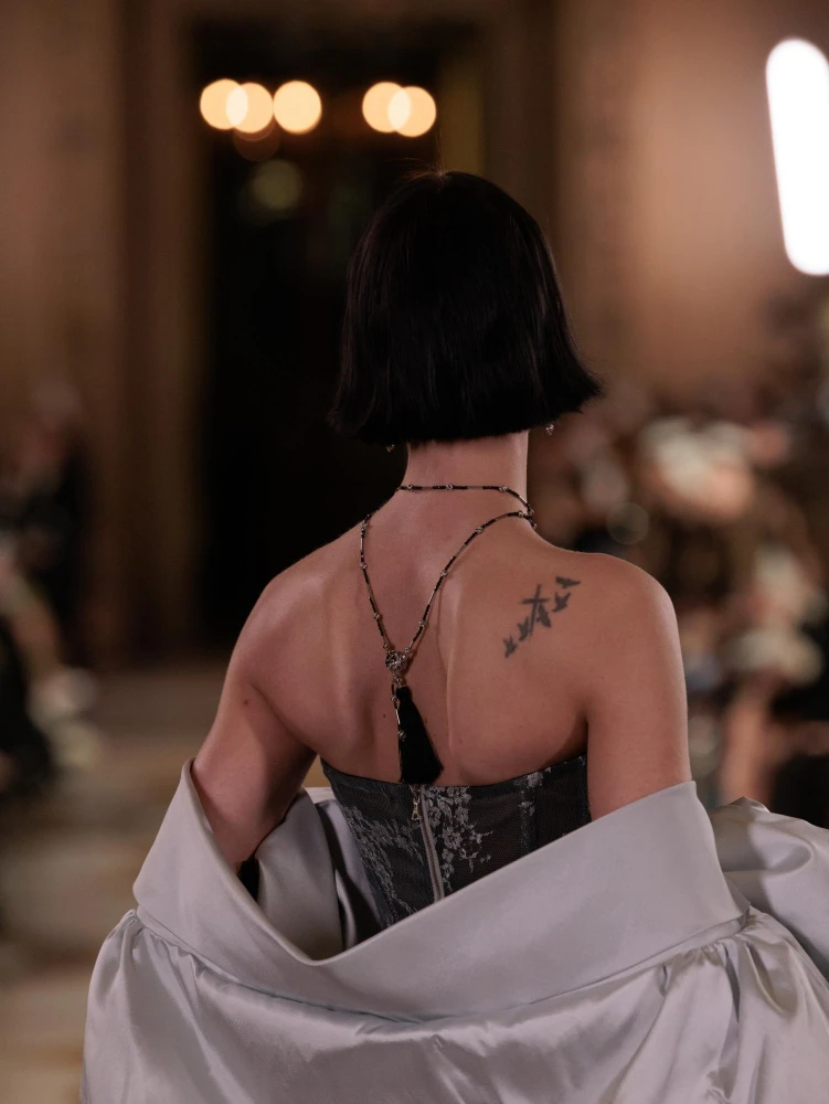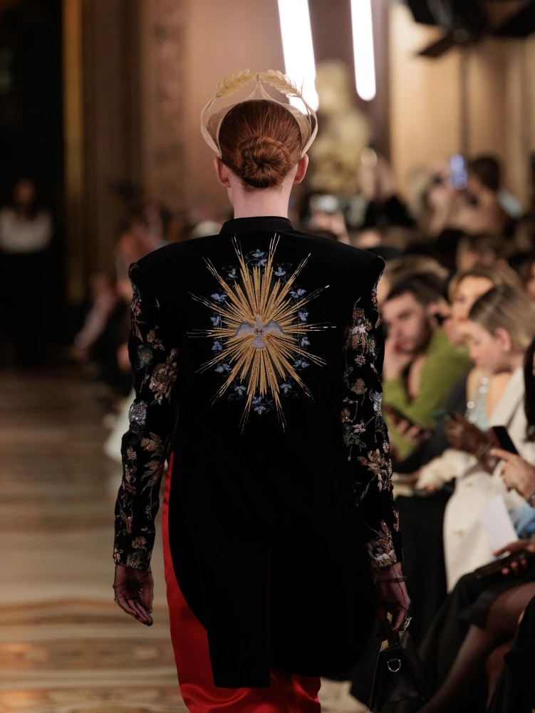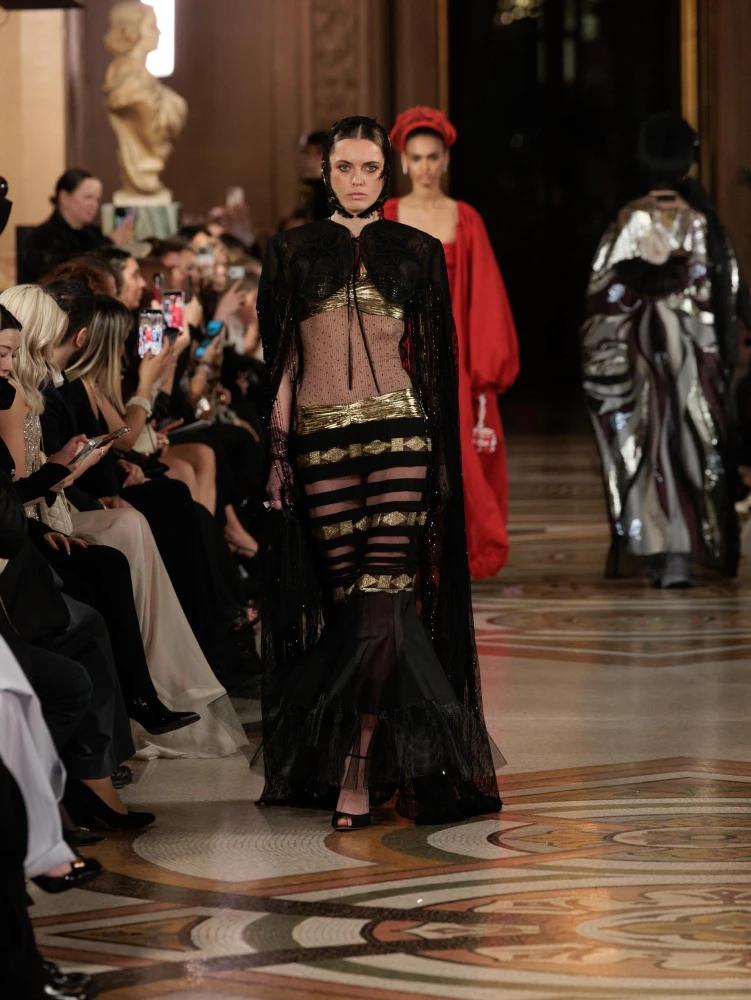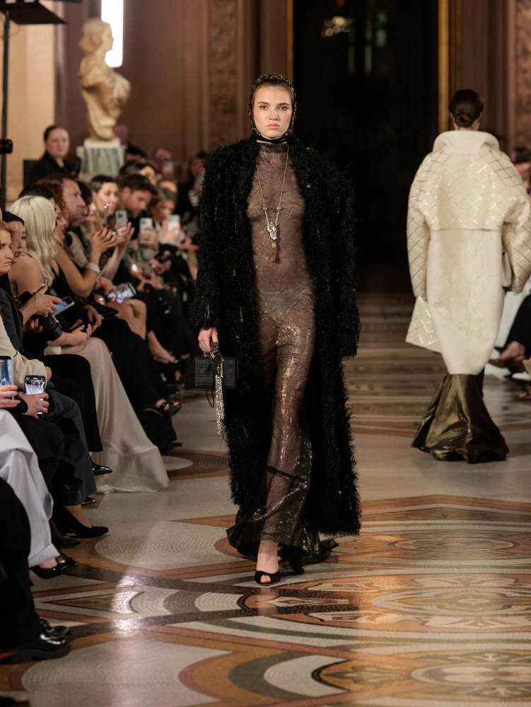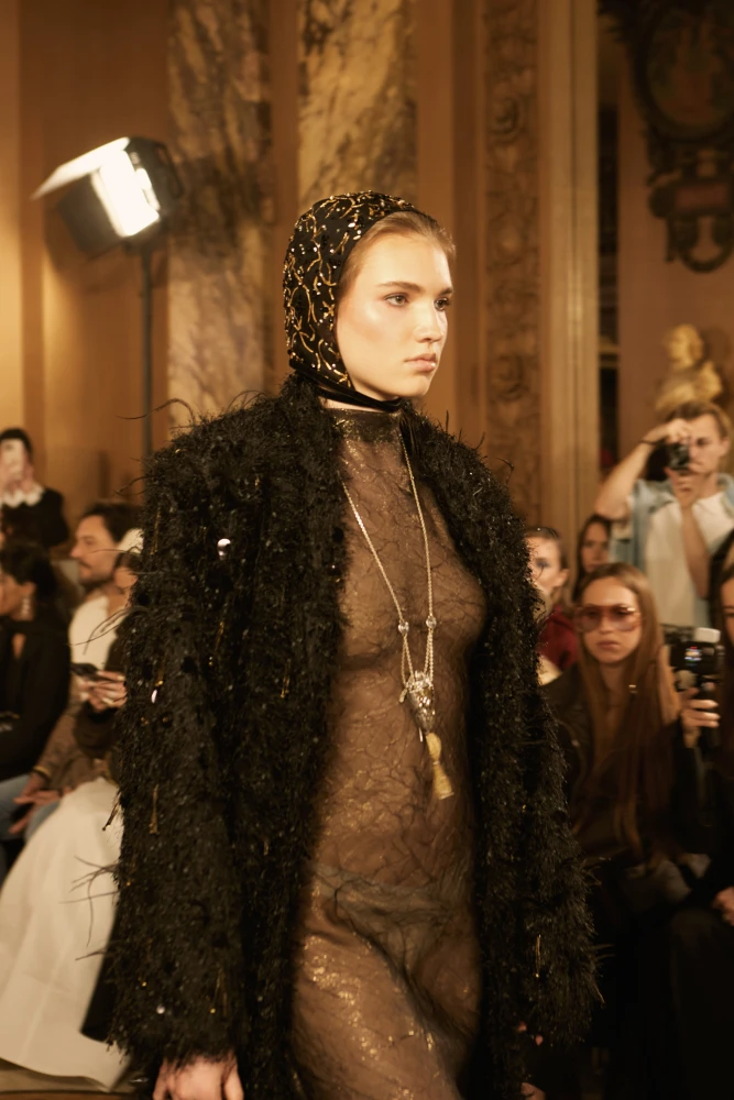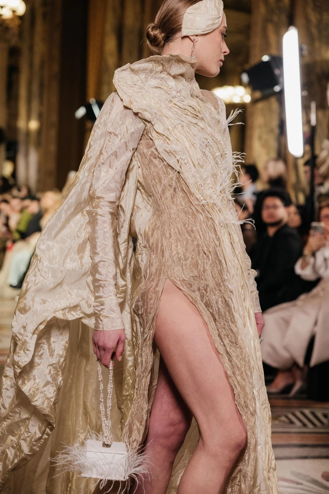 Фактури пір’я, бахрома зі стеклярусу та мереживні пелерини додають образам руху й театральності, а складні техніки вишивки artisanal haute couture формують характер кожної речі.