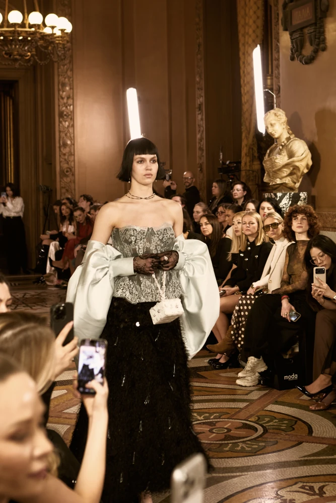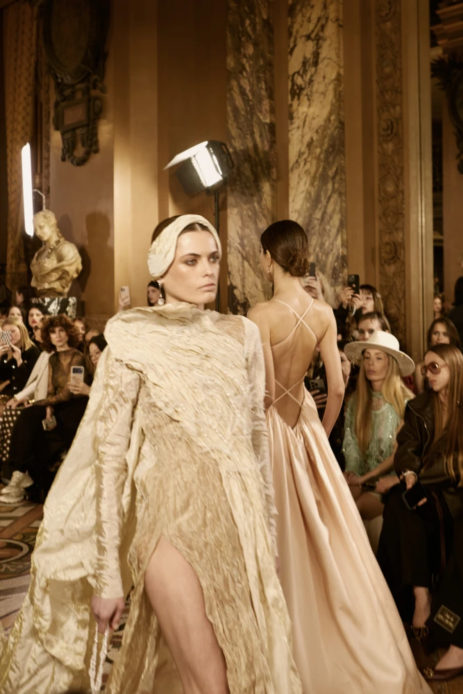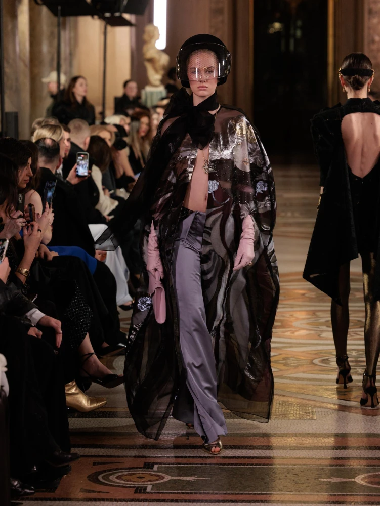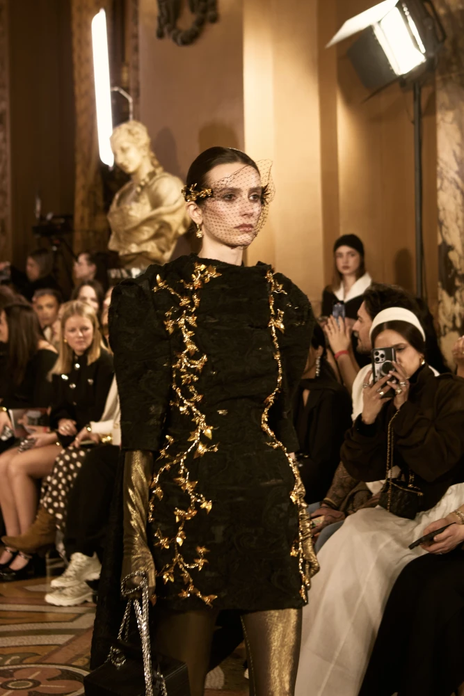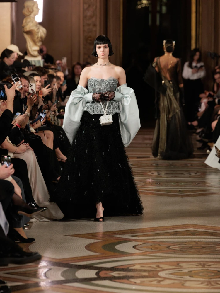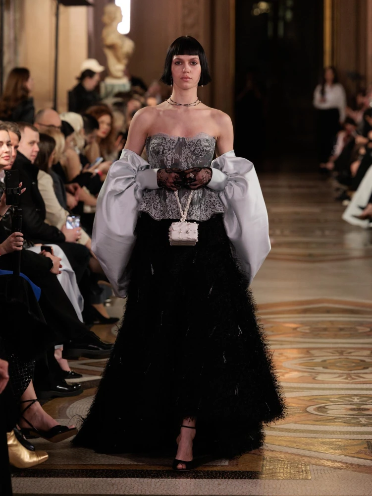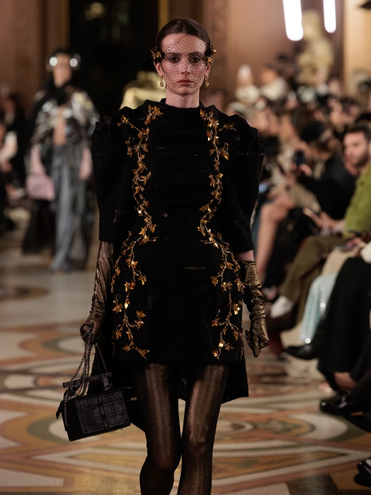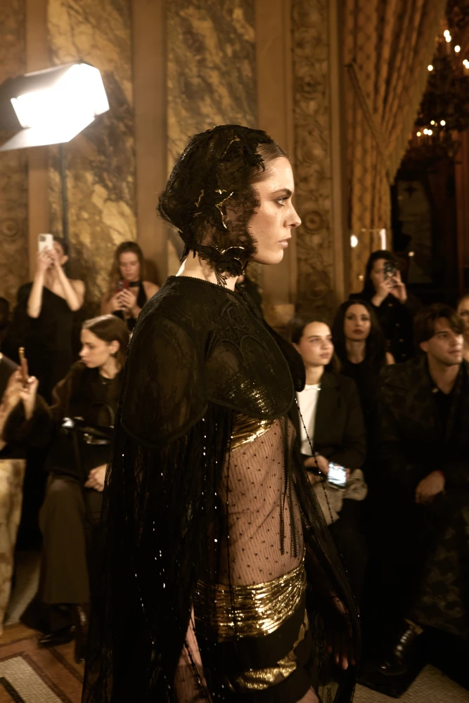Фактури пір’я, бахрома зі стеклярусу та мереживні пелерини додають образам руху й театральності, а складні техніки вишивки artisanal haute couture формують характер кожної речі.