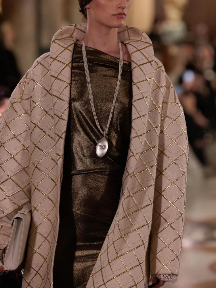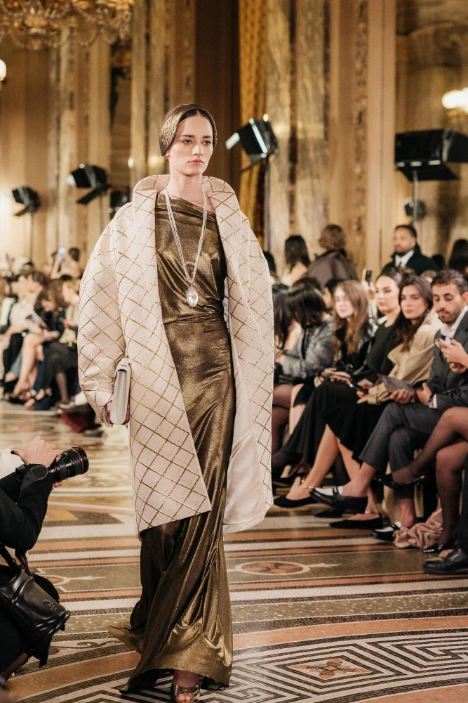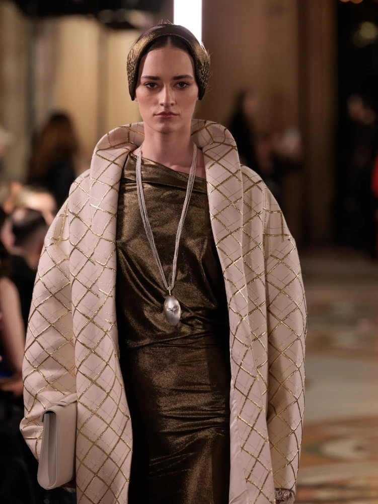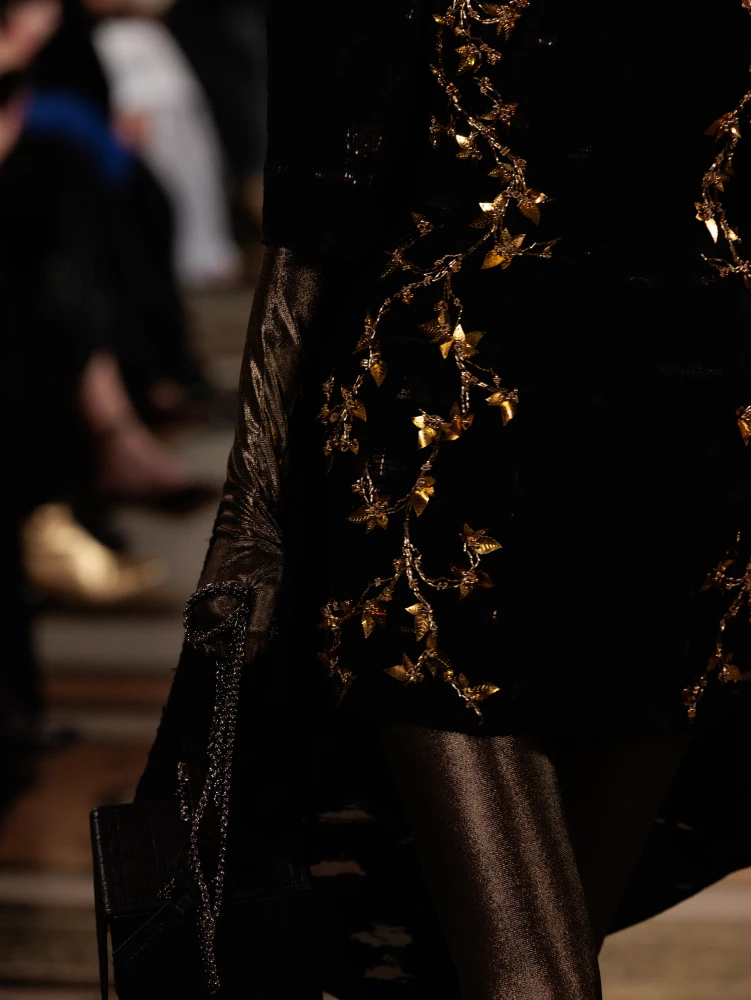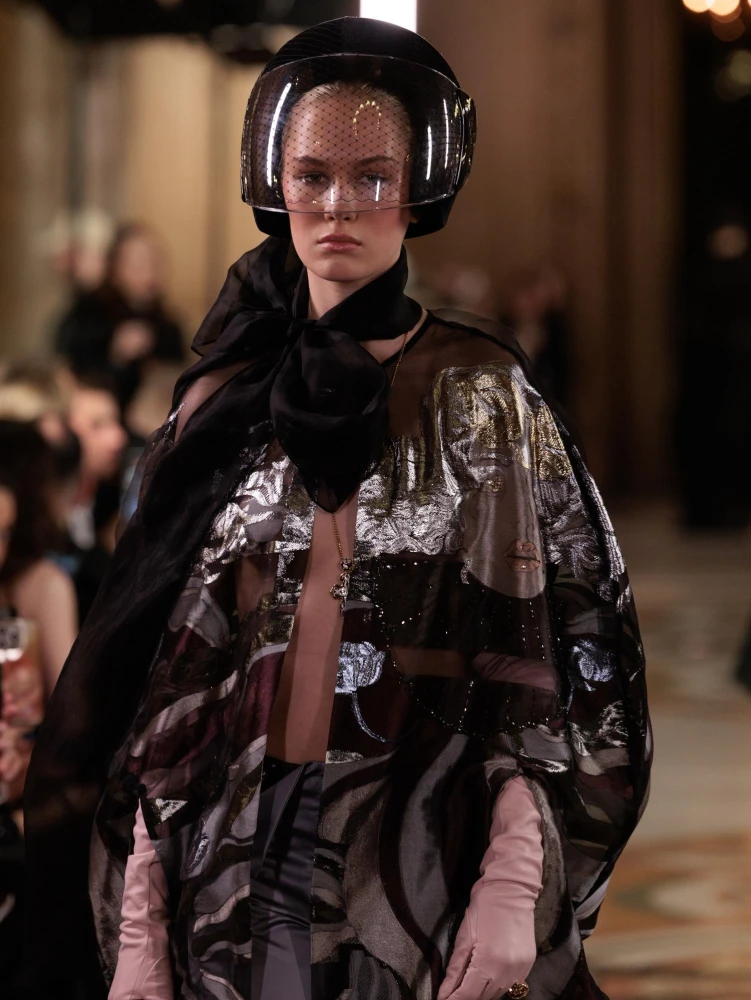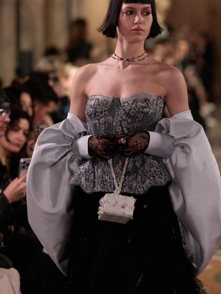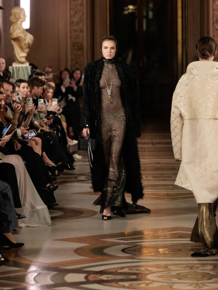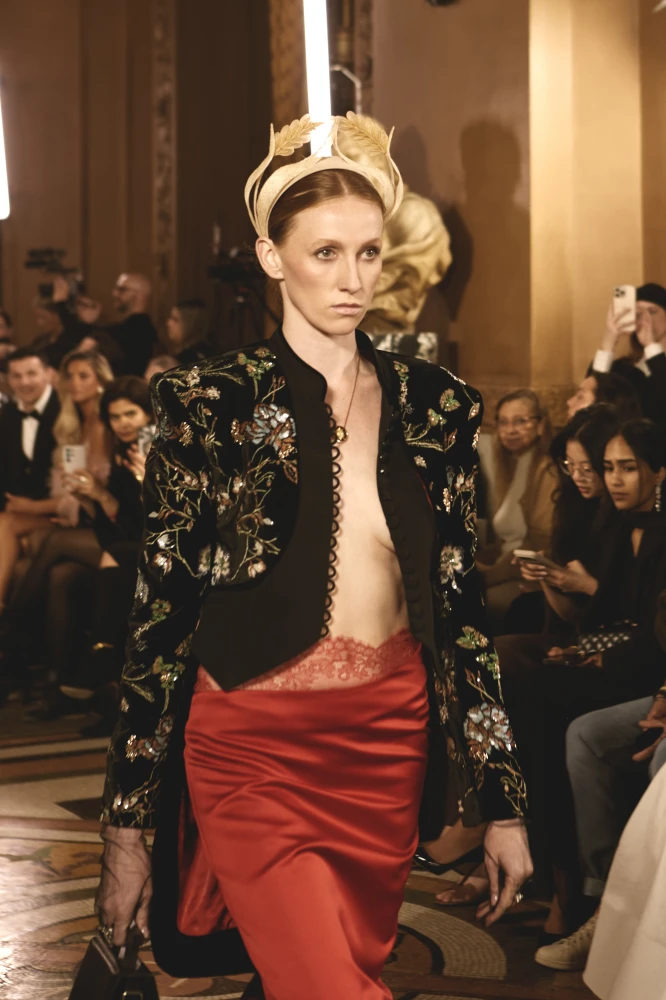 Фактури пір’я, бахрома зі стеклярусу та мереживні пелерини додають образам руху й театральності, а складні техніки вишивки artisanal haute couture формують характер кожної речі.