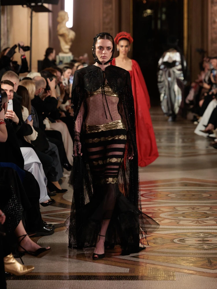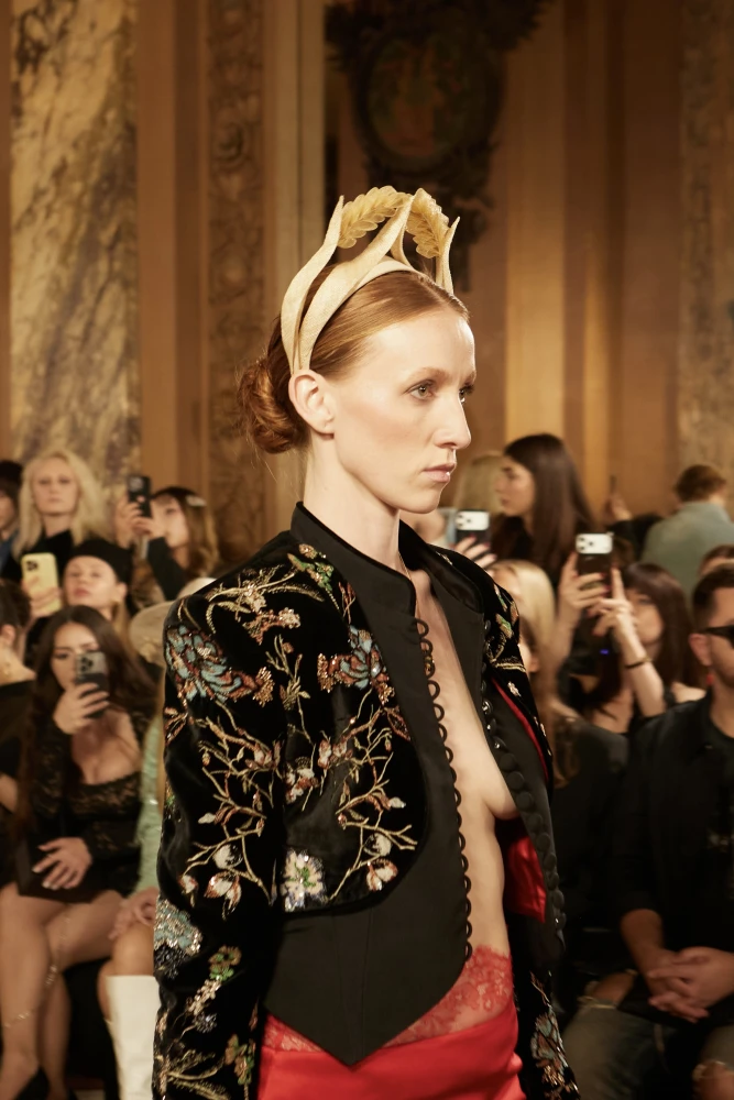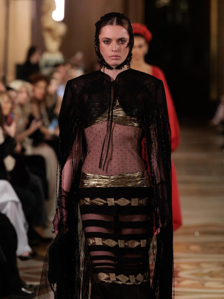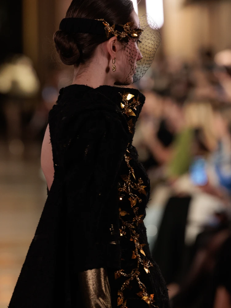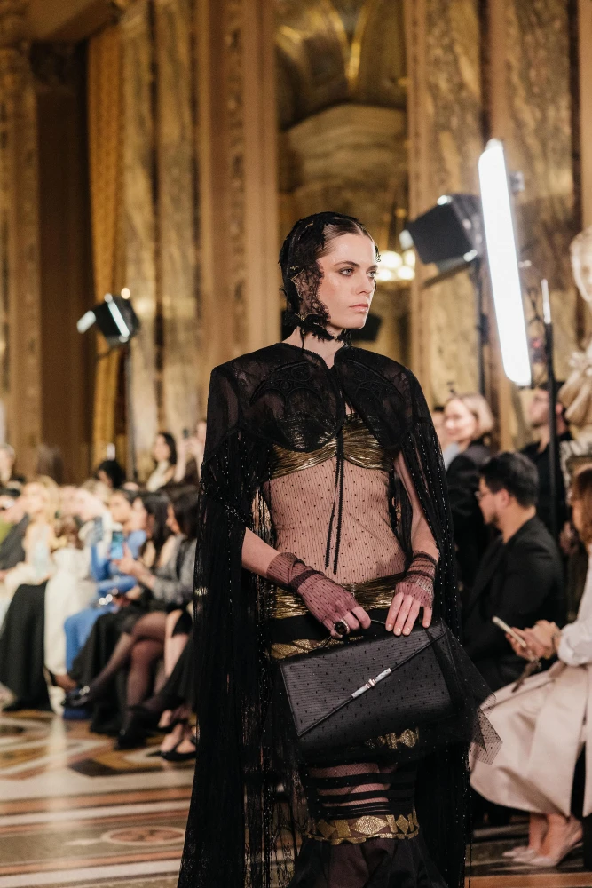 Драматургію показу формують архітектурні силуети та складна гра фактур. Серед ключових образів — гіпероб’ємні спідниці з парашутного шовку, мундир-фрак з розшитого оксамиту, кейпи з органзи з авторським орнаментом, структурні корсети та сукні з ефектом «рідкого скла». Окремим акцентом став вінтажний жакардовий гобелен, крізь який ніби пробивається золоте світло.