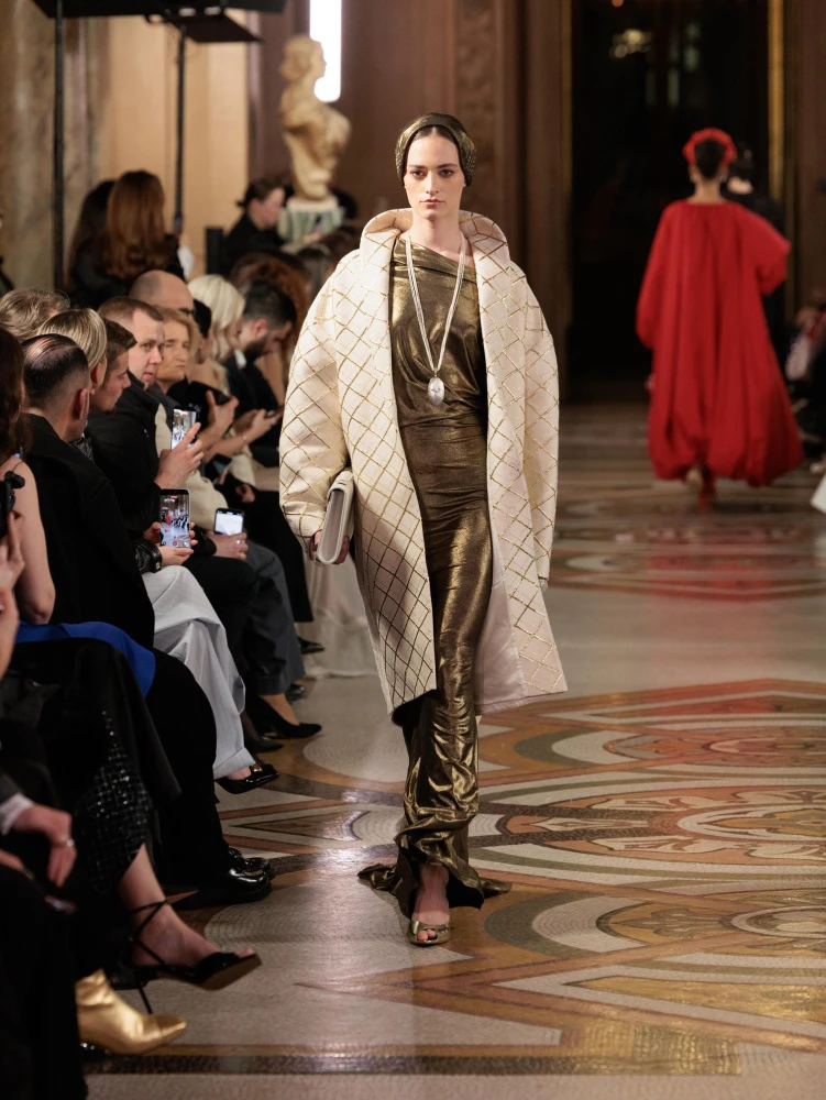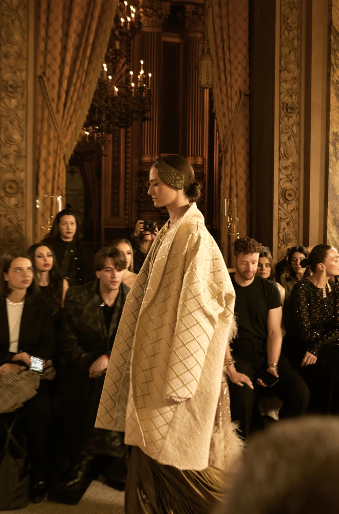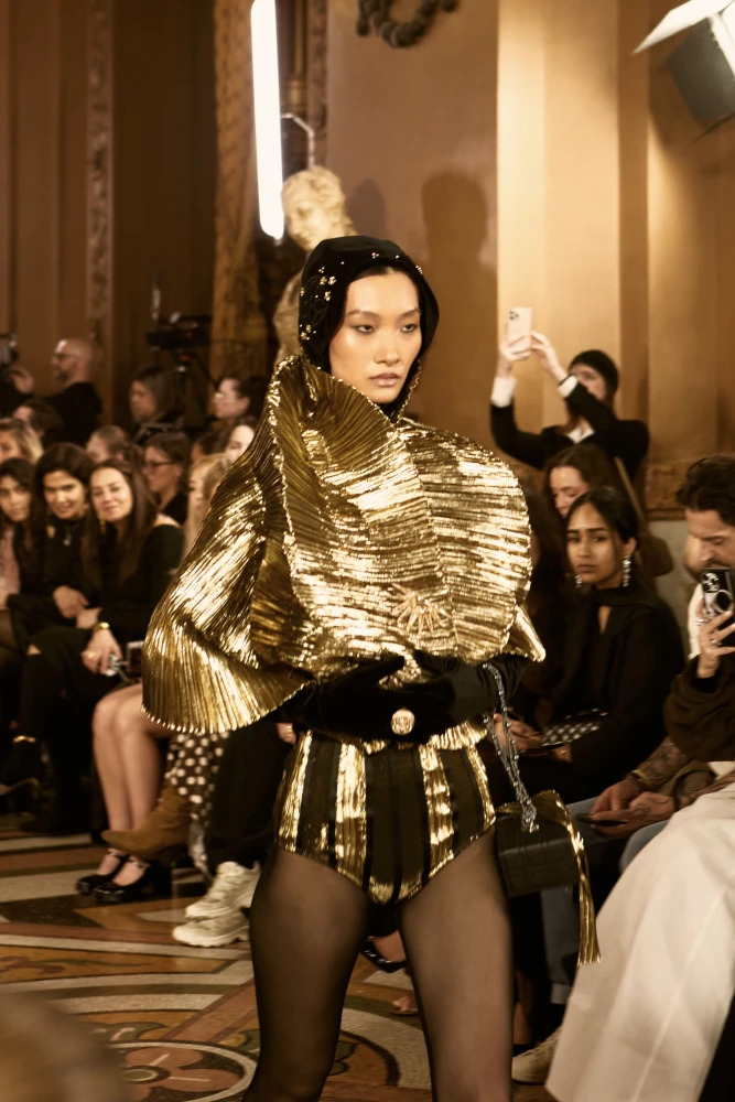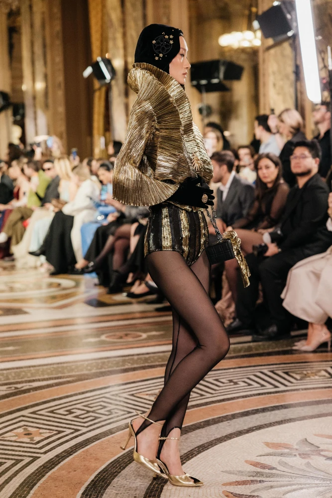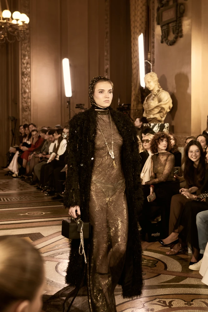 Драматургію показу формують архітектурні силуети та складна гра фактур. Серед ключових образів — гіпероб’ємні спідниці з парашутного шовку, мундир-фрак з розшитого оксамиту, кейпи з органзи з авторським орнаментом, структурні корсети та сукні з ефектом «рідкого скла». Окремим акцентом став вінтажний жакардовий гобелен, крізь який ніби пробивається золоте світло.