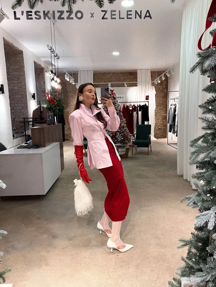 Рожева сорочка + червона мідіспідниця + червоні рукавички
