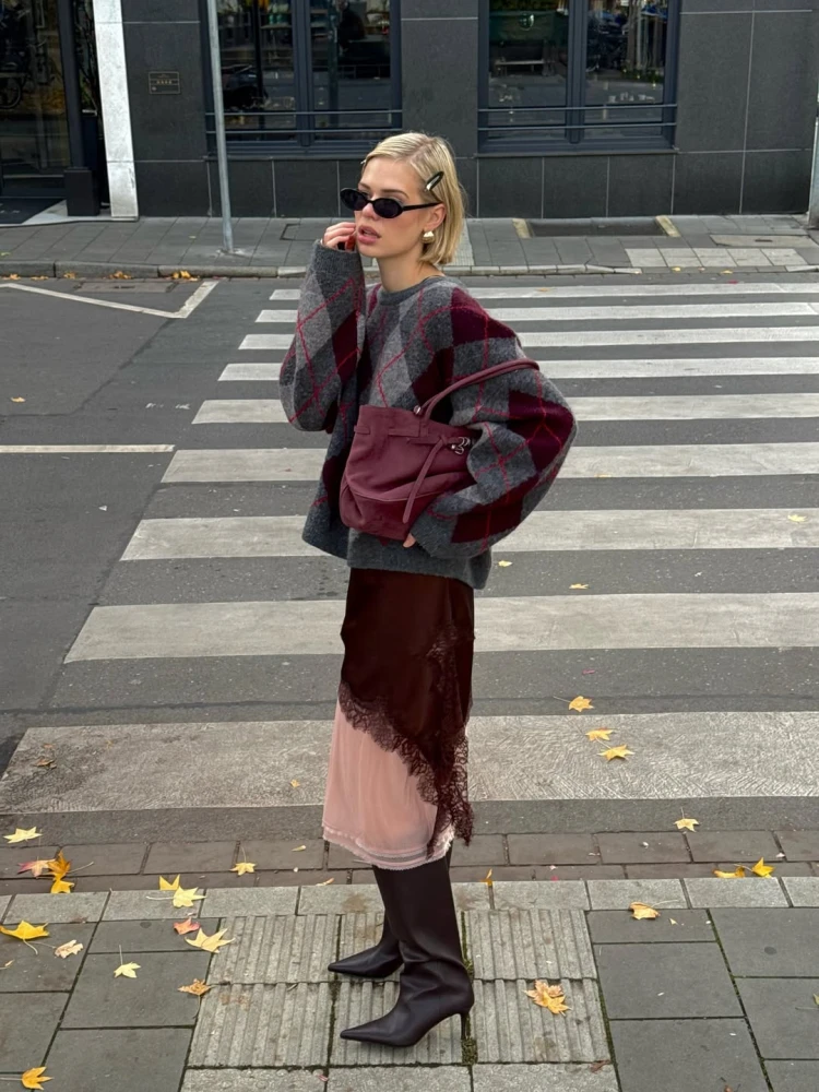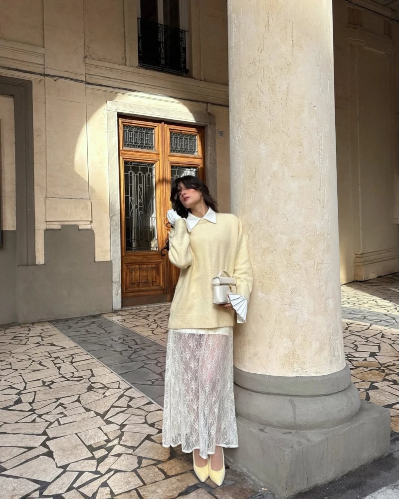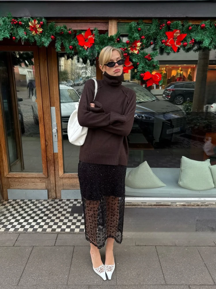 Наступна ідея для аутфіту — стилізувати свою давно відкладену напівпрозору спідницю, одягнувши зверху подовжений светр, як це роблять французькі модниці. Якщо ти переймаєшся з приводу недостатньої щільності такого низу, можеш доповнити лук атласним подовженим топом або додатковою сатиновою спідницею з косим низом. Гарним рішенням буде довершити образ поясом і кольоровими колготками (або панчохами).