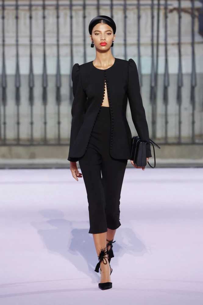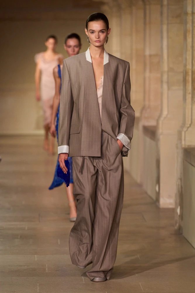 Ще один малопомітний, але дуже вагомий чинник, що впливає на загальний образ із жакетом, — це наявність лацканів. Як ми вже розповідали раніше, діловий верх без лацканів став новим цікавим хітом на показах SS’26. Тож самі по собі жакети з O- чи V-вирізом без вилог на грудях є чудовою інвестицією в цьогорічний гардероб. Вони, як і класичний верх, гармонійно поєднуються зі спідницями, джинсами чи брюками, і, окрім того, фешіоніста знаходять більш креативні стилізації для цього подіумного тренду. Наприклад, зав’язують кофти на талії поверх таких жакетів.