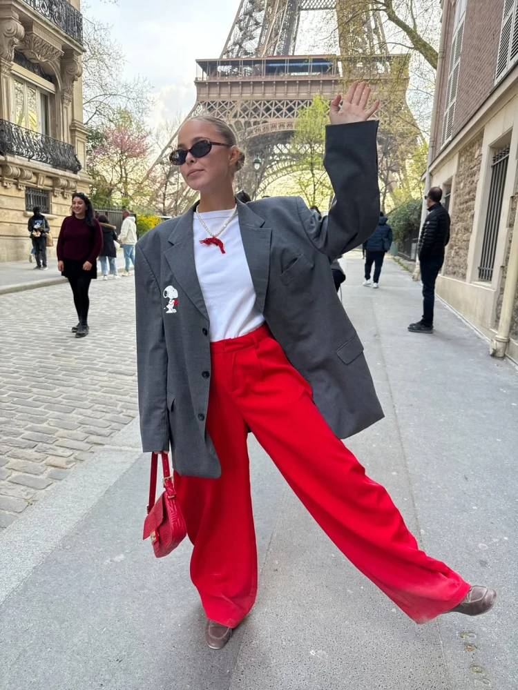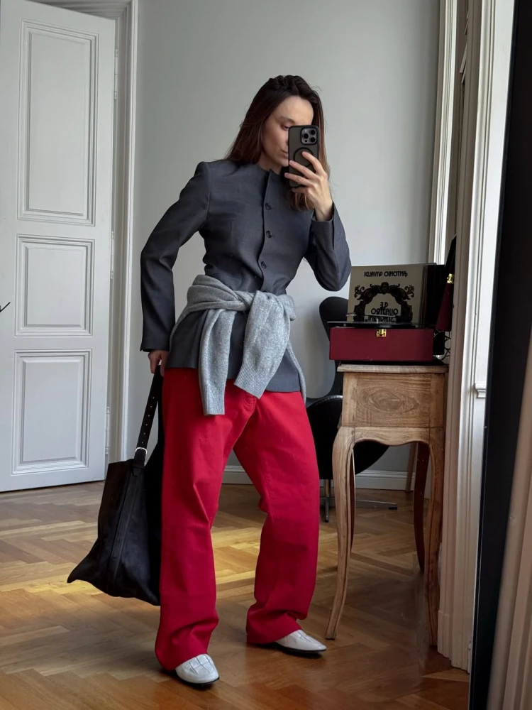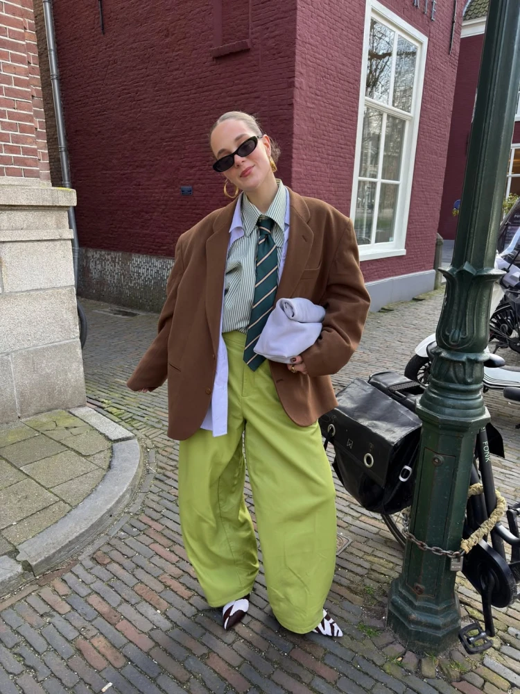 Кожен з варіантів стилізації, які ми зібрали для тебе, не складно відтворити вдома, однак цей, на наш погляд, має найяскравіший wow-ефект із найменшою затратою ресурсу на образ. Отож тобі знадобиться базовий жакет (або піджак чи блейзер) стриманого темного відтінку. Наприклад, сірий, чорний, темно-синій, шоколадний. А на низ — яскраві штани. Як ти вже здогадалася, тут у гру вступає мегатрендовий дофаміновий гардероб, і це один зі способів адаптувати його до повсякденного життя. Таким чином ти не ховаєш яскравість свого образу, але завдяки більш діловому верху він видаватиметься не надто «зухвалим».