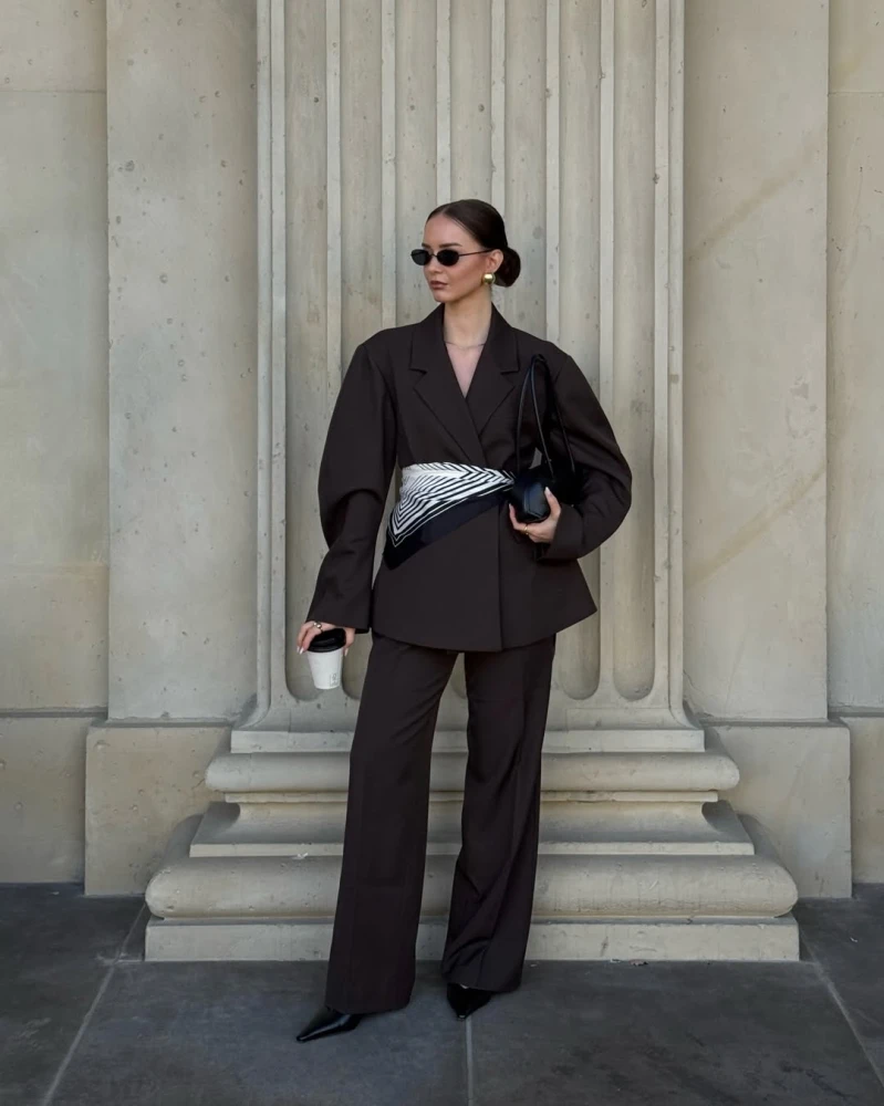 Цей спосіб стилізації віруситься в соцмережах уже не перший рік, але, з огляду на сторінки fashion-блогерок, він і досі актуальний. Дівчата обирають кольорові хустинки, щоб на основі oversize-жакетів отримувати приталені силуети, і, використовуючи атласний або мереживний аксесуар, урізноманітнюють сам аутфіт. Таким чином виходить елегантний наряд, який підійде і для побачення, і для робочого дня в офісі.