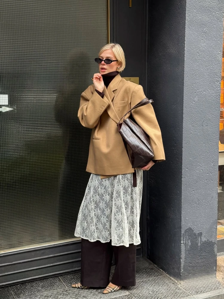 Сучасна мода не має рамок, і ми часто стаємо свідками цього, просто спостерігаючи за новими колекціями брендів. Завдяки цьому навіть casual-стиль часто є більш експериментальним, ніж прості формули: штани + піджак або спідниця + кардиган. Сьогодні модниці не бояться одягати одразу штани та спідницю і насолоджуватися захопленими поглядами перехожих. До чого ми ведемо? До ще однієї цікавої комбінації, яку полюбляють фешіоніста: піджак, штани та мереживна спідниця. Таке нашарування є водночас грою з текстурами та неординарним підходом до звичних айтемів. Саме тому воно є таким вірусним в Instagram та Pinterest, і саме тому це твій знак приміряти його навесні 2026 року.