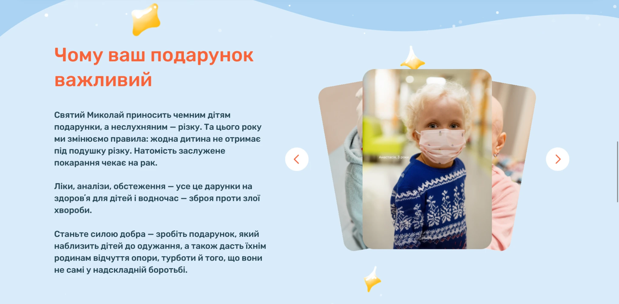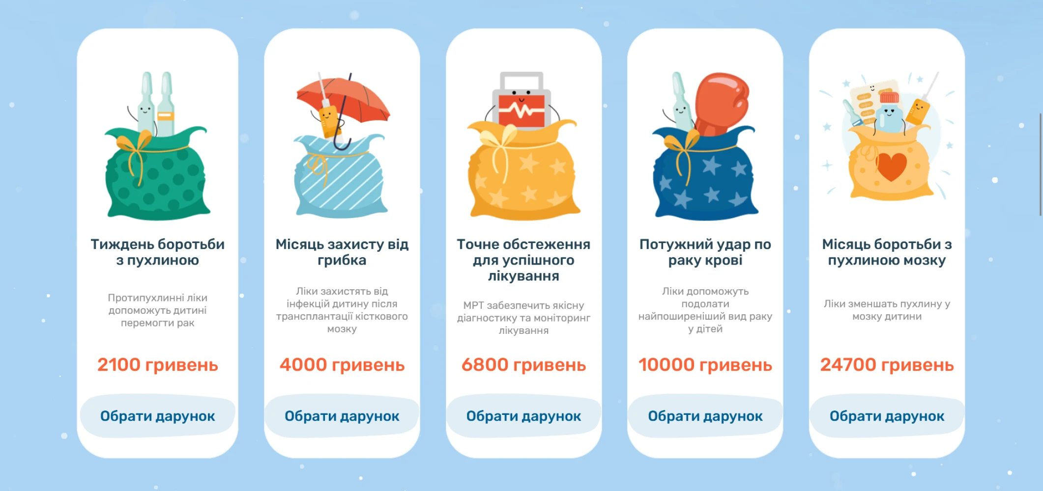 Щодня три українські сім’ї дізнаються, що в їхньої дитини рак. Але в більшості випадків він виліковний, якщо дитина вчасно отримує якісну допомогу. Подарунки з крамниці для сімей, які стикнулися з цією хворобою, — найцінніші, адже допомагають отримати все необхідне для омріяної перемоги.
