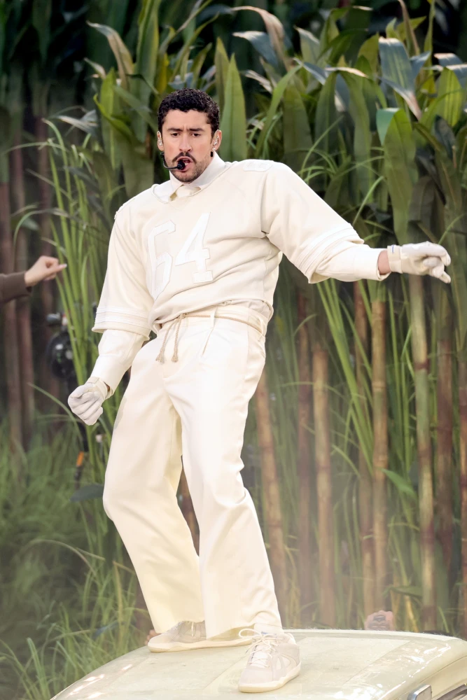Однак не менше за саме шоу глядачів вразив наряд Bad Bunny. Для однієї з найважливіших сцен у США він обрав не кутюрний костюм та не сет з останньої модної колекції, а кастомний total-look від Zara. Сорочка, білі штани, підв’язані мотузкою, та футболка з підплічниками, що імітує форму гравців у американський футбол, були повністю створені іспанським мас-маркет-брендом на замовлення співака.