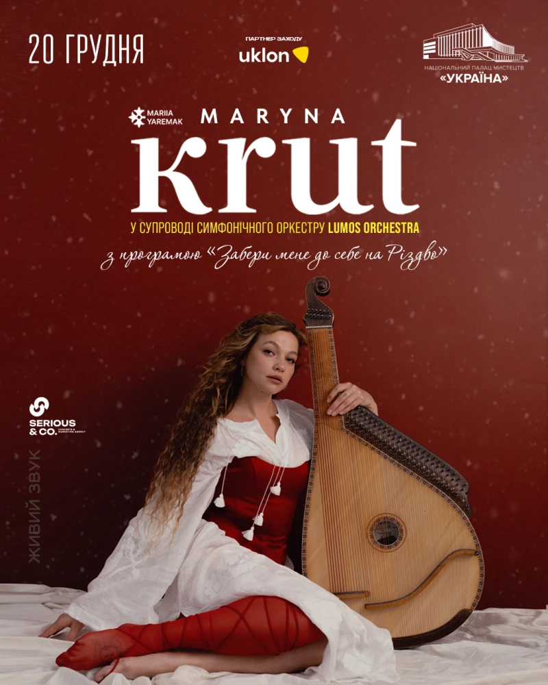 Співачка, композиторка та віртуозна бандуристка Марина Круть запрошує на великий концерт з ексклюзивною програмою «Забери мене до себе на Різдво» у супроводі симфонічного оркестру Lumos Orchestra. Ця особлива зимова подія відбудеться 20 грудня о 17:00 у Національному палаці мистецтв «Україна».