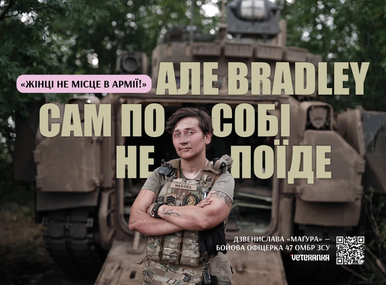 Інформаційна кампанія представлена двома форматами. Один з них — це соціальна реклама у вигляді плакатів у столичному метрополітені, на сітілайтах, щитах Києва та Львова, а також на залізничних вокзалах нашої країни. Фотопроєкт створювався разом з відомими в Україні фотографами Владою та Костянтином Ліберовими, які зняли військовослужбовиць за бойовою роботою на найгарячіших напрямках фронту. Особливістю фотомакетів є руйнування найбільш розповсюджених упереджень про місце жінок у лавах армії, з якими під час свого багаторічного військового шляху стикаються посестри спільноти руху VETERANKA. Організація разом з героїнями проєкту підготували на кожен стереотип свою відповідь: «Жінці не місце в армії!» — але Bradley сам собою не поїде; «Що вона там робить?» — командує артилерійською батареєю; «Прийшла в армію очима стріляти?» — ні, з міномета, гаубиці та РСЗВ...